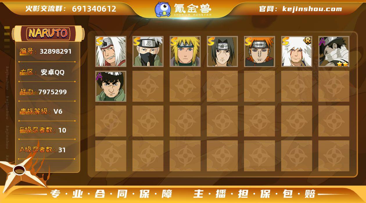 安卓QQ-可以二次!-v6-上忍-797w战力捡漏成品小号,到手即可畅玩,买到就是赚到-宇智波带土「十尾人柱力」-波风水门「九喇嘛连结」-旗木卡卡西「须佐能乎」-小南「神驹佑将」-神秘面具男「忍者之路」-千手扉间「漂泊武士」-S忍者数:10- A忍者数:31 【S级忍者】旗木卡卡西「须佐能乎」(3星),自来也「传说中的三忍」(3星),宇智波斑「秽土转生·解」(3星),波风水门「九喇嘛连结」(3星),自来也「舞之豪杰」(3星),宇智波带土「十尾人柱力」(3星),宇智波鼬「须佐能乎」(3星),漩涡鸣人·宇智波佐助(3星),佩恩「天道」(4星),波风水门(3星), 【A级忍者】宇智波佐助「须佐能乎」(2星),大蛇丸「晓」(2星),药师兜「半蛇斗篷」(2星),漩涡鸣人「九尾查克拉」(2星),李洛克「忍界大战」(2星),不动(2星),蝎「绯流琥」(2星),秋道丁次「忍界大战」(2星),宇智波泉奈(2星),干柿鬼鲛(5星),猿飞阿斯玛(5星),迈特凯(5星),蝎(2星),桃地再不斩(2星),猿飞阿斯玛「秽土转生」(2星),我爱罗「疾风传」(3星),飞段(3星),飞段「死司凭血」(2星),千手扉间「漂泊武士」(2星),波风水门「青年」(2星),桃地再不斩「秽土转生」(2星),日向宁次「忍界大战」(2星),长十郎「六代目水影」(2...