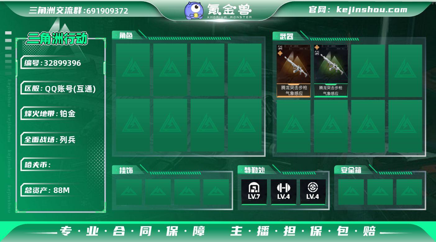 [18155793]总资产:88.7M 1干员外观 2近战传说 12传说枪械 哈夫币:20.284K 高级安全箱(2×3)4.11号到期 不可修改实名 【烽火地带段位】铂金 【全面战场段位】列兵 【干员外观】露娜-金牌射手(S7) 【传说武器皮肤】近战武器-暗星,近战-信条,M7战斗步枪-棱镜攻势S2(典藏),腾龙突击步枪-气象感应(典藏),M250通用机枪-骑士之心,SG552突击步枪-运动员,P90冲锋枪-信条,47突击步枪-暗星,SR-25射手步枪-信条,SCAR-H战斗步枪-启航,G3战斗步枪-骑士,KC17突击步枪-电锯惊魂 【史诗武器皮肤】ASh-12战斗步枪-无极限,G3战斗步枪-流沙送葬,AWM狙击步枪-流沙送葬