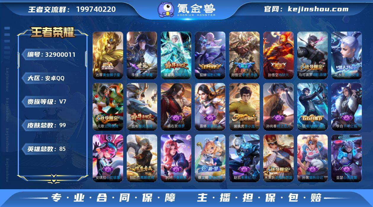 实名: 可修改 性别: 男号 贵族等级: V7 英雄数: 85 皮肤数: 99 传说皮: 黄金狮子座,猫影幻舞,一念神魔,地狱火,零号·赤焰 限定皮: 李小龙,御风骁将,时雨天司,默契交锋-花木兰 亮点: 【优质装备】:黄金狮子座,猫影幻舞,一念神魔,地狱火,零号·赤焰