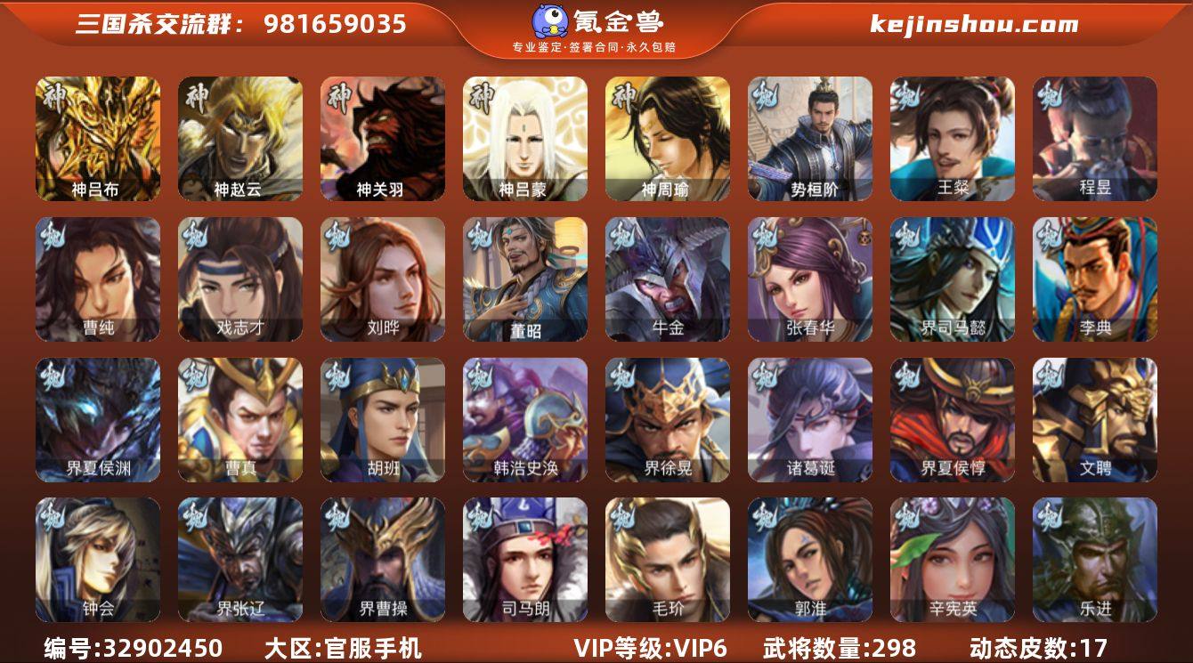 神赵云,五星戏志才(动),满星周处(动),满星水果忍者郑玄,满星王璨,乌龟傅佥,满星花鬘,谋马超(动),满星谋夏侯氏,势桓阶(动)且开令,刘晔,神吕布,程昱,兀突骨,曹纯,曹丕动皮,李儒(动),鲁肃(动)将魂:5823,羽毛:65578,9甲4令,7千多超多菜篮子,超多动皮和材料,近300武将,VIP:6,皮肤:271,超多三卡!出过三次66,爆率很高