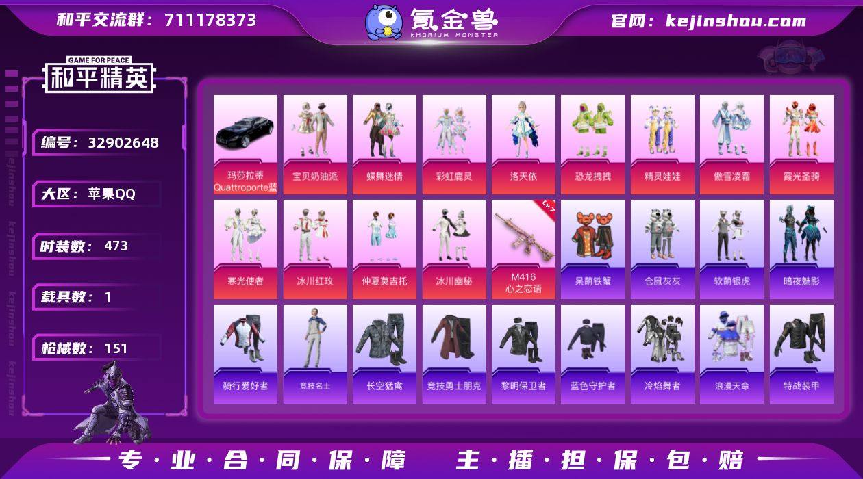 实名: 可修改 时装数: 473 载具数: 1 枪械数: 151 战备数: 1 热门装扮: 蝶舞迷情,呆萌铁蟹,宝贝奶油派,彩虹鹿灵,洛天依,精灵娃娃,恐龙拽拽,霞光圣骑,寒光使者,傲雪凌霜,冰川红玫,冰川幽秘,仓鼠灰灰,软萌银虎,仲夏莫吉托,暗夜魅影 载具: 玛莎拉蒂Quattroporte(夜幕蓝) 稀有枪皮: M416心之恋语 亮点: 【优质装备】:七级M416-心之恋语