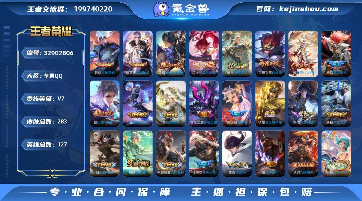 【Hwz1005】【精品打野小号】苹果Q-V7--127英雄-283皮肤-2典藏皮肤-20传说-81史诗(星域神启、弑枪猎影、琥珀纪元、齐天大圣、山海苍雷引、白虎志、浮生妄) 【英雄全皮】:孙权全皮,敖隐全皮,戈娅全皮,影全皮 【荣耀典藏】:诸葛亮星域神启,韩信弑枪猎影 【传说皮肤】:马超神骥逐星野,花木兰异界灵契,后羿神树通天,澜愿照九州拓,桑启鸣野蒿,马超琥珀纪元,澜逐花归海,夏洛特浮生妄,孙悟空齐天大圣,曜山海苍雷引,李白诗剑行,马超无双飞将,铠绛天战甲,镜炽阳神光,曜云鹰飞将,李信一念神魔,干将莫邪久胜战神,达摩黄金狮子座,百里玄策白虎志,宫本武藏地狱之眼 【限定皮肤】:蒙犽顽岩魄,姜子牙天穹之誓,狄仁杰阴阳师,赵云皇家上将,高渐离玩趣恶龙,元歌云间偶戏,元歌无心,马可波罗暗影游猎,马可波罗山海玄木吟,狄仁杰魔术师,达摩沙漠行僧,项羽海滩派对,韩信飞衡,韩信傲雪梅枪,兰陵王金庭之子,孙悟空至尊宝,孙悟空孙行者,孙悟空齐天大圣,李元芳云中旅人,鬼谷子五谷丰年,百里玄策白虎志,百里玄策原初追逐者,沈梦溪大漠名商,裴擒虎李小龙,裴擒虎擒涛扼浪,云中君纤云弄巧,嫦娥拒霜思,曜山海苍雷引,西施玲珑珍味,鲁班大师探海日志...