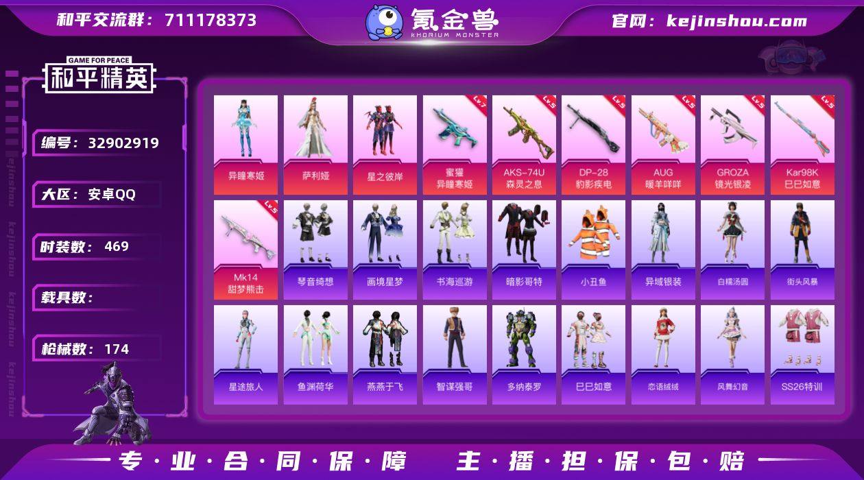 【特价出售】安卓Q-1稀有3粉装10特效枪5热门120套装174枪皮 43867热力值 7印记 历史卓越王牌6星 【1稀有】 AKM-缤纷海域 【3粉装】 萨利娅 异瞳寒姬 星之彼岸 【10特效枪】 AKS-74U-森灵之息 (5级) Kar98K-巳巳如意 (5级) DP-28-豹影疾电 (5级) AUG-暖羊咩咩 (5级) 蜜獾-异瞳寒姬 (7级) Mk14-甜梦熊击 (5级) GROZA-镜光银凌 (5级) AKS-74U-森灵之息 (5级) Mk14-福马献瑞 (5级) AA12-G-萌骑幻想 (3级) 【5热门】 小丑鱼 暗影哥特 漫步者 极速红龙 军刀雅典娜
