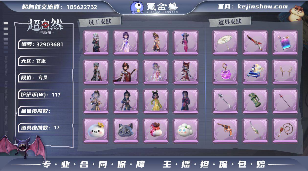 紫皮12;道具皮17;皮肤:爱丽丝-甜梦派对,薇薇安-仙锋小姐,小黄-呱呱雨衣,艾伦-黎明猎手,莉莉-除妖小师妹,爱丽丝-丝缕哀歌,巫铃儿-琢玉怀乡,莉莉-莓果陷阱,爱丽丝-耀眼的你,阿念-庆宴绮愿,爱德华-梵卓之礼,逍遥-绣春逍影;道具:短管猎枪-安魂曲,铲子-撒拉弗的祷告,刺刀-碧络琅环,闪光弹-金戈玄铜,腰包-红运福虎,闪光弹-邪恶滚滚猫,伞-郁金春信,急救包-蔷薇物语,音响-鸣沙鼓,转轮手枪-新星时代,黄牛能量饮料-星空特调,长鞭-缚誓之锁,音响-月光奏鸣曲,夜视仪-敛花容,长枪-罪棘,荧光棒-花火-荧光棒-花火,伞-伞;饰品:头饰-滑稽头套,头饰-饺饺者头套,头饰-蒜了八,头饰-太空鲨头套,头饰-精致露比头套,头饰-煤球喵头套,头饰-火爆了头套,头饰-萨卡班甲鱼头套,头饰-呆滞头套,头饰-樱桃奶油布丁,头饰-大葱明头套,头饰-面具马头套,头饰-芝麻糊汤圆,头饰-嘻嘻头套,头饰-鱼头怪头套,头饰-卑微头套,头饰-腊肠扭扭,头饰-炙热烧烤,头饰-雪墩墩头套,头饰-哈士奇头套,头饰-惊魂南瓜头套,头饰-马上有钱,头饰-烛光纪念,头饰-烈焰红唇头套,头饰-像素朋克墨镜,头饰-后室幸存者头套,挂饰-晚安小熊,挂饰-桂冠聆诗,挂饰-九色祥鹿,挂饰-孤独对望,挂饰-不朽的今夜,挂饰-拂云仙,背饰-白鼬趴趴,背饰-蝶...