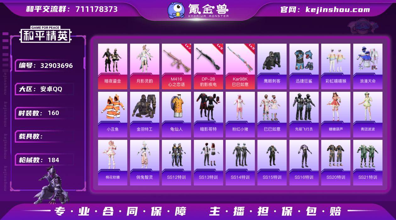 安卓 手Q-2粉装-3特效枪-0载具-2粉色飞行器-55889热力值-11王牌印记-160套装-184枪皮 【热门品类】:套装-浪漫天命,套装-小丑鱼,套装-金羽特工,套装-龟仙人,套装-暗影哥特,套装-粉红小猪 【粉色套装】:粉装-暗夜鎏金,角色-月影灵韵 【粉色枪皮等级】:M416-心之恋语(七级),Kar98K-巳巳如意(五级),DP-28-豹影疾电(五级) 【粉色枪皮】:M416-心之恋语,Kar98K-巳巳如意,DP-28-豹影疾电 【粉色飞行器】:炫彩糖果飞行器,星空武士飞行器 【粉色降落伞】:烈焰拳霸降落伞,音爆索尼克降落伞,第五大道降落伞,仲夏莫吉托降落伞,莲影清波降落伞,鬼刀降落伞 【稀有套装】:套装-龟仙人,套装-巳巳如意,套装-先驱飞行员,套装-糖糖葫芦,套装-青团波波,套装-棉花软糖,角色-俏兔智灵 【稀有枪皮】:AKM-夜灯,AKM-彩虹符号,AKM-影袭,AKM-破晓战魂,AKM-缤纷海域,AKM-萌趣颜团子,AKM-龙的传人,M16A4-夜灯,M16A4-幻世战舞者,M16A4-红色方程式,M16A4-蓝色火焰,SCAR-L-夜灯,SCAR-L-炫彩节奏,SCAR-L-玉兔迎春,SCAR-L-红色方程式,M416-夜灯,M416-糯团青竹,M416-红色方程式,M416-绯红前夜,M416-蓝色火焰,GROZA-彩虹符号,GROZA-影袭,GROZA-懵萌河马,GROZA...
