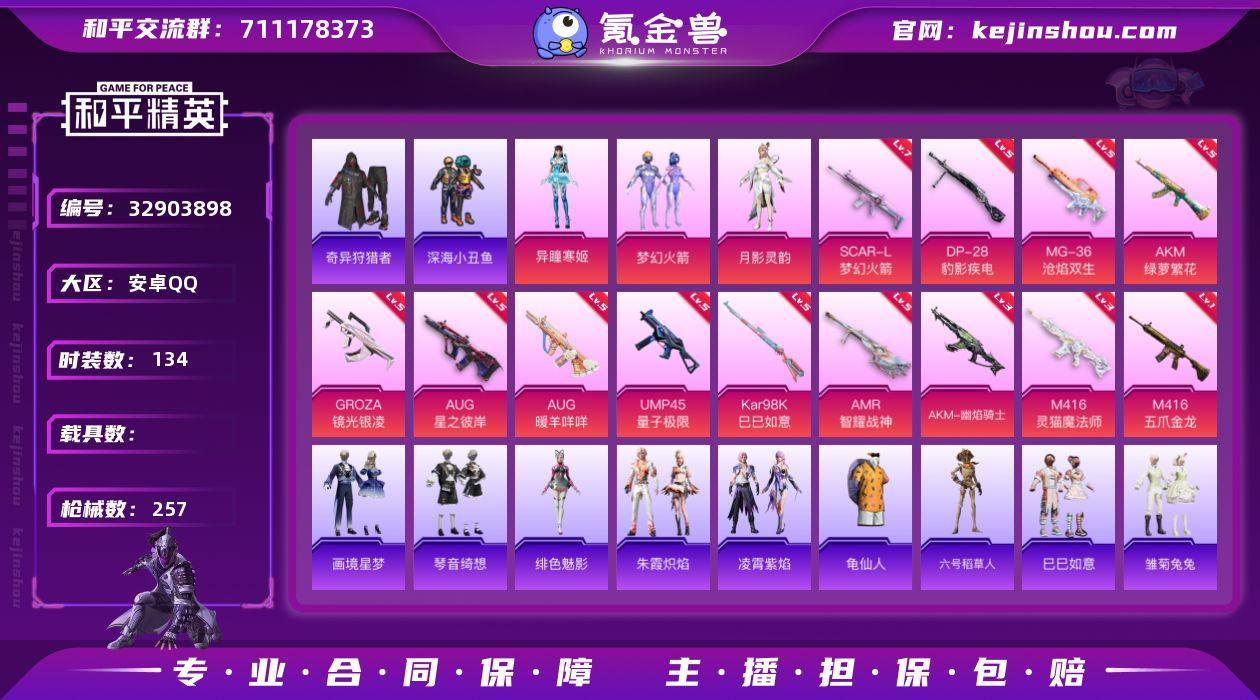 安卓 【小号 粉装-梦幻火箭/套装-深海小丑鱼/SCAR-L-梦幻火箭(七级)/Kar98K-巳巳如意(五级)/AUG-暖羊咩咩(五级)/Mk14-福马献瑞(五级)/梦幻火箭背包(3级)】手Q-4粉装-16特效枪-0载具-5粉色飞行器-73391热力值-11王牌印记-134套装-257枪皮 【热门品类】:粉装-梦幻火箭,套装-深海小丑鱼,套装-奇异狩猎者,套装-龟仙人,角色-六号稻草人 【粉色套装】:粉装-梦幻火箭,角色-月影灵韵,角色-异瞳寒姬 【粉色枪皮等级】:AKM-绿萝繁花(五级),AKM-幽焰骑士(三级),SCAR-L-梦幻火箭(七级),M416-五爪金龙(一级),M416-灵猫魔法师(三级),GROZA-镜光银凌(五级),AUG-星之彼岸(五级),AUG-暖羊咩咩(五级),ACE32-萌骑漫游(一级),UMP45-量子极限(五级),AKS-74U-森灵之息(五级),Kar98K-巳巳如意(五级),Mk14-福马献瑞(五级),AMR-智耀战神(五级),DP-28-豹影疾电(五级),MG-36-沧焰双生(五级) 【粉色枪皮】:AKM-绿萝繁花,AKM-幽焰骑士,SCAR-L-梦幻火箭,M416-五爪金龙,M416-灵猫魔法师,GROZA-镜光银凌,AUG-星之彼岸,AUG-暖羊咩咩,ACE32-萌骑漫游,UMP45-量子极限,AKS-74U-森灵之息,Kar98K-巳巳如意,Mk14-福马献瑞,AMR-智耀战神,DP-28-豹影疾电,MG-36-沧焰双生 【粉色...