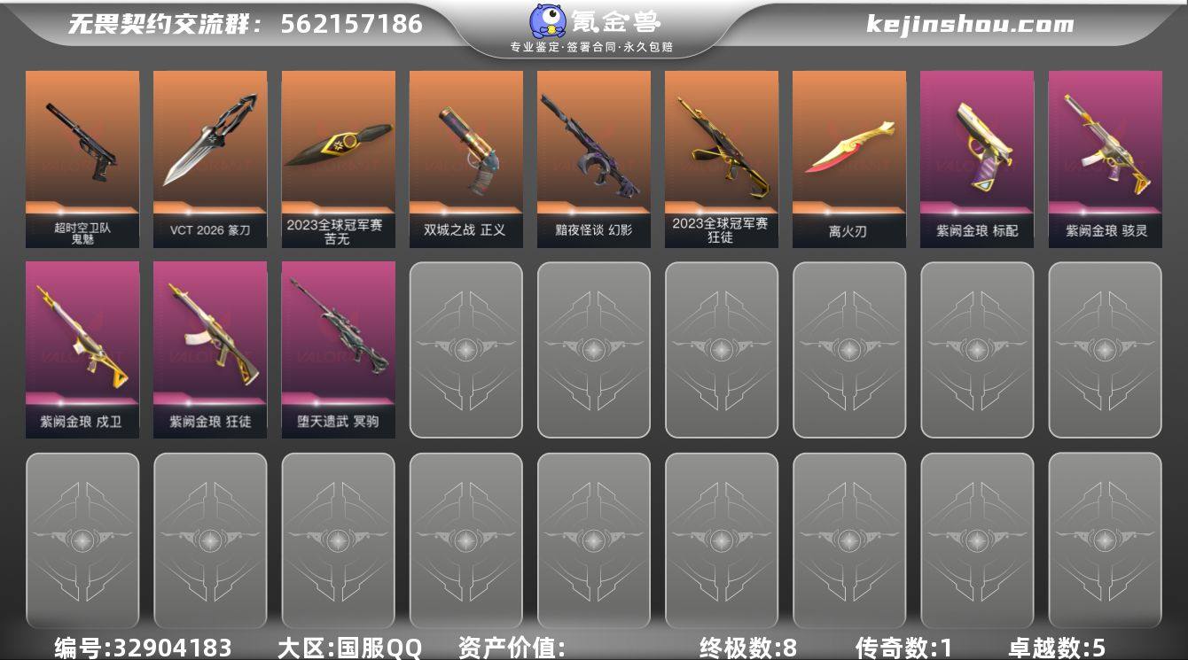 段位: 青铜 亮点皮肤: 离火刃,正义-双城之战,狂徒-2023全球冠军赛,苦无-2023全球冠军赛 套装: 2023全球冠军赛套装,紫阙金琅套装,《双城之战》收藏套装,离火刃套装 近战武器皮肤: VCT 2026 篆刀 步枪皮肤: 戍卫-紫阙金琅,狂徒-紫阙金琅,幻影-黯夜怪谈 佩枪皮肤: 标配-紫阙金琅,鬼魅-超时空卫队 狙击枪皮肤: 冥驹-堕天遗武 冲锋枪皮肤: 骇灵-紫阙金琅 亮点: 【套装】:离火刃套装,2023全球冠军赛套装,VCT 2026 赛季套装,离火刃套装,《英雄联盟:双城之战》套装,紫阙金琅套装,无畏启程套装【英雄】:炼狱,维斯,暮蝶,壹决,铁臂,捷风,雷兹,不死鸟,贤者,猎枭,芮娜,尚勃勒,霓虹,斯凯,夜露,K/O,海神,盖可,黑梦,钢锁【近战武器】:近战武器-2023全球冠军赛 苦无,近战武器-VCT 2026 篆刀,近战武器-离火刃,近战武器-金琅斧【狂徒】:狂徒-2023全球冠军赛,狂徒-紫阙金琅【幻影】:幻影-黯夜怪谈【戍卫】:戍卫-紫阙金琅【獠犬】:獠犬-数码咒术【冥驹】:冥驹-堕天遗武,冥驹-花漾粉红【飞将】:飞将-合金战车【战神】:战神-数码咒术【判官】:判官-数码咒术【骇灵】:骇灵-紫阙金琅,骇灵-花漾粉红【蜂刺】:蜂刺-合金战车【标配】:标配-紫阙金琅,标配-...