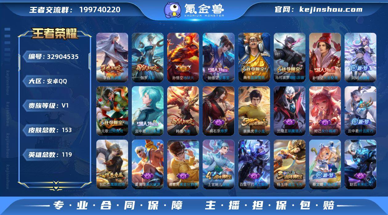 【Hwz1002】【特价出售】 安卓Q-V7-可二次-119英雄-153皮肤-3传说-34史诗(至尊宝、凤求凰、太华) 【传说皮肤】:伽罗太华,李白凤求凰,孙悟空地狱火 【限定皮肤】:狄仁杰阴阳师,赵云皇家上将,嬴政白昼王子,芈月重明,吕布猎兽之王,周瑜赤莲之焰,元歌云间偶戏,夏侯惇朔风刀,曹操烛龙,典韦穷奇,典韦蓝屏警告,马可波罗暗影游猎,狄仁杰魔术师,狄仁杰万华元夜,达摩沙漠行僧,项羽海滩派对,老夫子醍醐杖,程咬金演武夺筹,韩信飞衡,兰陵王驯魔猎人,亚瑟潮玩骑士王,孙悟空至尊宝,孙悟空大圣娶亲,牛魔御旌,钟馗驱傩正仪,杨玉环遇见飞天,女娲朔望之晖,干将莫邪胡桃夹子,雅典娜单词大作战,蔡文姬繁星吟游,太乙真人饕餮,鬼谷子原初探秘者,弈星混沌棋,明世隐疑决卦,裴擒虎李小龙,狂铁御狮,米莱狄御霄,云中君纤云弄巧,云中君时之祈愿,伽罗太华,盾山御銮,猪八戒西部大镖客,上官婉儿梁祝,蒙犽狂想玩偶喵 【年限皮肤】:李白凤求凰,伽罗太华,韩信飞衡 【赛季限定】:太乙真人饕餮,曹操烛龙,芈月重明,典韦穷奇,狂铁御狮,米莱狄御霄,牛魔御旌,盾山御銮,夏侯惇朔风刀,弈星混沌棋,明世隐疑决卦,老夫子醍醐杖,鬼谷子原初探秘者,狄仁杰万...