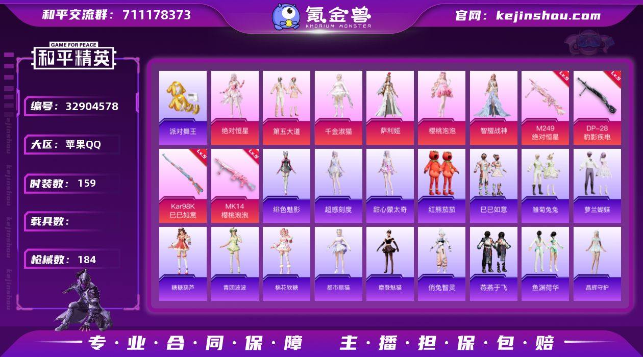苹果 手Q-无敌战神框-6粉装-5特效枪-0载具-4粉色飞行器-56887热力值-13王牌印记-159套装-184枪皮 QW2633016 【热门品类】:套装-派对舞王,套装-红熊茄茄 【粉色套装】:角色-绝对恒星,粉装-第五大道,角色-千金淑猫,角色-萨利娅,角色-樱桃泡泡,角色-智耀战神 【粉色枪皮等级】:Kar98K-巳巳如意(五级),Mk14-樱桃泡泡(五级),Mk14-福马献瑞(五级),M249-绝对恒星(七级),DP-28-豹影疾电(五级) 【粉色枪皮】:Kar98K-巳巳如意,Mk14-樱桃泡泡,Mk14-福马献瑞,M249-绝对恒星,DP-28-豹影疾电 【粉色飞行器】:绝对恒星飞行器,炫彩糖果飞行器,月下星之子飞行器,极意拳锋飞行器 【粉色降落伞】:绝对恒星降落伞,第五大道降落伞,蜜语绒猫降落伞,时空协奏降落伞,千金淑猫降落伞,月影灵韵降落伞,赛博古神降落伞,彩虹独角兽降落伞,樱桃泡泡降落伞,戏水时光降落伞,冷漠罗丽降落伞,荧海星豚降落伞,无垠阁降落伞,喜羊羊与灰太狼降落伞,异瞳寒姬降落伞,炫彩糖果降落伞 【稀有套装】:套装-巳巳如意,角色-超感刻度,角色-甜心蒙太奇,套装-雪国风尚,套装-炫彩糖果,套装-马上来财,套装-迅捷龙虾,套装-雏菊兔兔,套装-萝兰蝴蝶,套装-糖糖葫芦,套装-青团波波,...