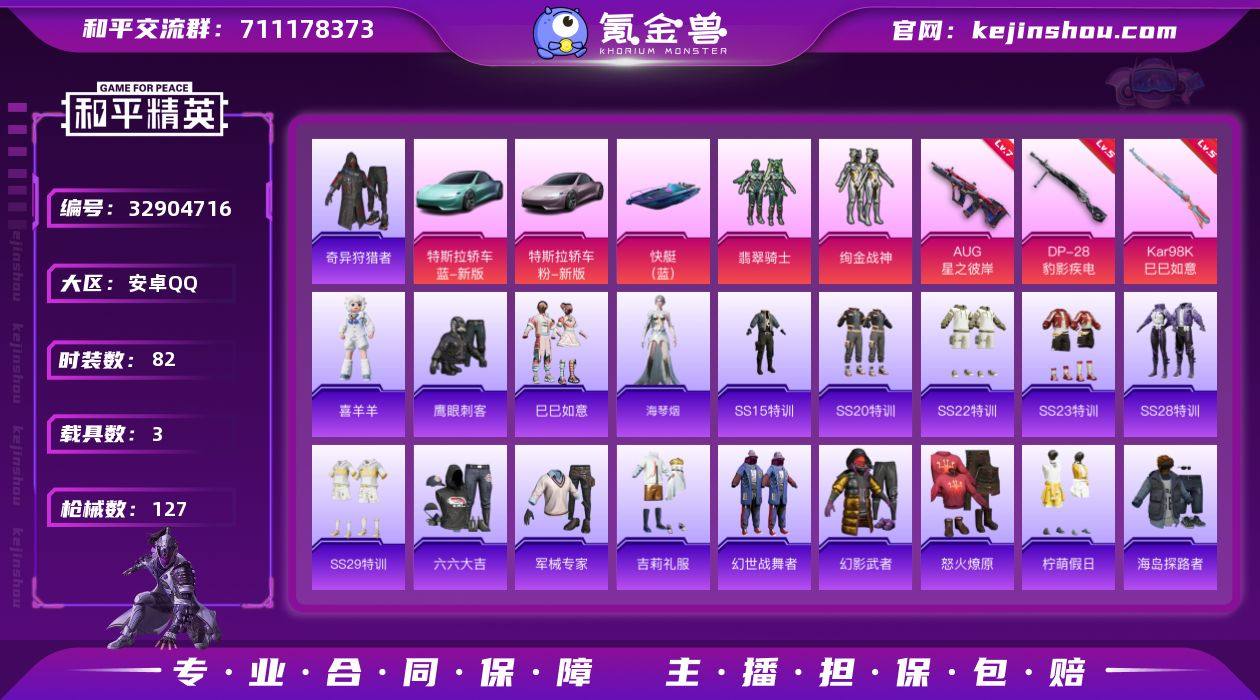 安卓 手Q-2粉装-5特效枪-3载具-2粉色飞行器-39705热力值-10王牌印记-82套装-127枪皮 【热门品类】:套装-奇异狩猎者 【粉色套装】:粉装-翡翠骑士,粉装-绚金战神 【粉色枪皮等级】:AUG-星之彼岸(七级),UMP45-萌骑冒险(二级),Kar98K-巳巳如意(五级),Mk14-福马献瑞(五级),DP-28-豹影疾电(五级) 【粉色载具】:特斯拉Roadster(水滴蓝),特斯拉Roadster(沁心粉),空客H135-蔚蓝之翼,快艇-塞莎KL27(深潜蓝) 【粉色枪皮】:AUG-星之彼岸,UMP45-萌骑冒险,Kar98K-巳巳如意,Mk14-福马献瑞,DP-28-豹影疾电 【粉色飞行器】:炫彩糖果飞行器,激战未来飞行器 【粉色降落伞】:绮梦青鸾降落伞,星之彼岸降落伞,怪笑疯兔降落伞,鬼刀降落伞,星穹咏叹调降落伞,异瞳寒姬降落伞,炫彩糖果降落伞 【稀有套装】:套装-巳巳如意,套装-雪国风尚,套装-炫彩糖果,套装-马上来财,套装-迅捷龙虾,角色-海琴烟,玩偶服-喜羊羊 【稀有枪皮】:AUG-冰晶雪宝,AKM-彩虹符号,AKM-影袭,AKM-星之彼岸,AKM-生命誓言,AKM-萌趣颜团子,AKM-龙的传人,M16A4-幻世战舞者,M16A4-甜心亚梦,SCAR-L-夜灯,SCAR-L-暗夜玫瑰,SCAR-L-炫彩节奏,SCAR-L-玉兔迎春,SCAR-L-红色方程式,M416-梨...