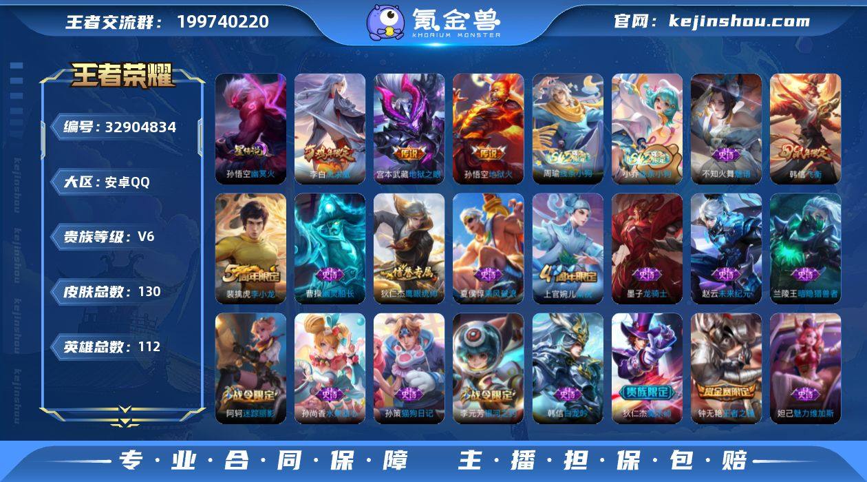 贵族6/皮肤130/传说3/史诗24/英雄112/影全皮/李信问心剑/幽冥火/凤求凰/地狱之眼/地狱火/阴阳师/皇家上将/迷踪丽影/王者之锤/朔风刀(s17)/魔术师/万华元夜(s22)/海滩派对/醍醐杖(s20)/演武夺筹(s23)/夺宝奇兵/飞衡/银河之约/驱傩正仪(s24)/单词大作战/原初探秘者(s21)/千军破阵(s25)/混沌棋(s18)/星空之诺/疑决卦(s19)/李小龙/御銮(s16)/梁祝/狂想玩偶喵/荣光之誓/线条小狗-周瑜/线条小狗-小乔/钟馗锁墨魂/魅语/鹰眼统帅/猫狗日记-孙策/冰冠公主/暗隐猎兽者/乘风破浪/白龙吟/幽灵船长/龙骑士/魅力维加斯/水果甜心/偶像歌手/未来纪元-赵云/影百相守梦/吕布舞狮寰/线条小狗-妲己/苍云破阵/糖果风暴/溯影追猎/魅影绮裳/功夫炙烤/刘邦虎啸剑宗/无双福将/乓乓大师/缤纷绘卷/次元傲视/秘密基地/圆桌骑士(盾山)/黑桃队长/鲨炮海盗猫/丁香结/奇妙博物学/虹云星官/坚韧之力/功夫老勺/命运角斗场/海滩丽影/龙腾万里/汉昭烈帝/纽约教父/阿尔法小队/万象初新/万事如意/拳王/死亡骑士/黄金武士/少女阿狸/天使之翼/玩偶对对碰/未来纪元-宫本武藏/白色死神/星际陆战队(程咬金)/红桃皇后/大发明家/哥特玫瑰/街头霸王/教廷特使/赤焰之缨/启蛰/孤猎/秩序猎龙将/冰刃幻境/归虚梦演-蒙犽/归虚...