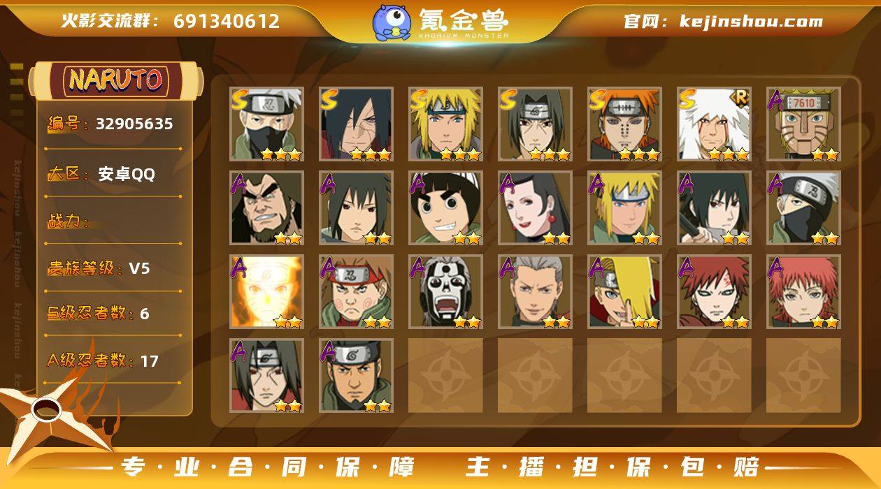 V5/S忍6/A忍17/三星S-自来也「舞之豪杰」/二星A-旗木卡卡西「忍界大战」/二星A-我爱罗「疾风传」/二星A-飞段「死司凭血」/二星A-宇智波鼬/三星S-旗木卡卡西「须佐能乎」/二星A-蝎/三星S-佩恩「天道」/二星A-飞段/二星A-神农 「羁绊」/二星A-猿飞阿斯玛/三星S-波风水门/二星A-宇智波泉奈/二星A-秋道丁次「忍界大战」/二星A-迪达拉/三星S-宇智波斑「秽土转生·解」/二星A-漩涡鸣人「九尾查克拉」/二星A-不缘/二星A-宇智波佐助「须佐能乎」/二星A-李洛克「忍界大战」/二星A-机械鸣人「初始形态」/三星S-宇智波鼬 「须佐能乎」/二星A-波风水门 「青年」