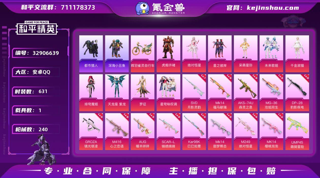 实名: 可修改 时装数: 631 载具数: 1 枪械数: 240 战备数: 1 热门装扮: 呆萌铁蟹,深海小丑鱼,鹰眼刺客,都市猎人,星之彼岸,兔兔白日梦,呆萌星弥,未来歌姬,千金淑猫,天龙座 紫龙,星穹咏叹调,罗征,绯穹魔姬,绝对恒星,虎痴许褚 载具: 辉羽雀灵自行车 稀有枪皮: M416心之恋语,SCAR-L-锦绣绵绵,GROZA-镜光银凌,SVD-月影灵韵,Kar98K-巳巳如意,AUG-暖羊咩咩,MK14-樱桃泡泡,MK14-甜梦熊击,DP-28-豹影疾电,MG-36-沧焰双生,M249-绝对恒星,AKS-74U-森灵之息,MK14-福马献瑞,UMP45-萌骑冒险 亮点: 【优质装备】:暗影哥特(红眼罩),都市猎人,七级SVD-月影灵韵