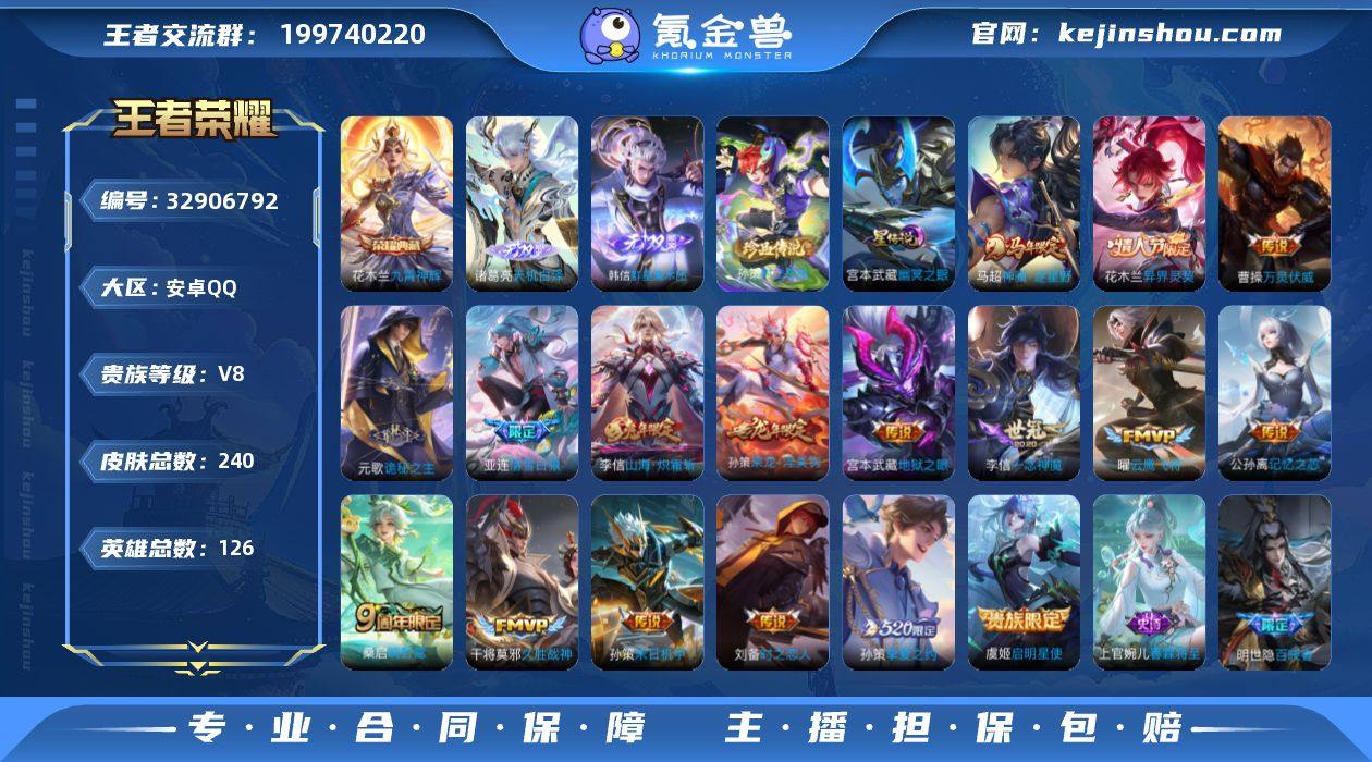 1万1花木兰,金标木兰金标孙策Q-V8-荣耀王者段位-126英雄-240皮肤-1典藏皮肤-2无双-1珍品传说-17传说-68史诗 【英雄全皮】:元歌全皮,孙权全皮,孙策全皮,戈娅全皮,影全皮 【荣耀典藏】:花木兰九霄神辉 【无双皮肤】:诸葛亮天机白泽,韩信群星魔术团 【珍品传说】:孙策时之奇旅 【传说皮肤】:马超神骥逐星野,花木兰异界灵契,曹操万灵伏威,元歌诡秘之主,桑启鸣野蒿,亚连落雪白狼,孙策乘龙淬吴钩,公孙离记忆之芯,李信山海炽霜斩,孙策挚爱之约,孙策末日机甲,虞姬启明星使,曜云鹰飞将,李信一念神魔,刘备时之恋人,干将莫邪久胜战神,宫本武藏地狱之眼