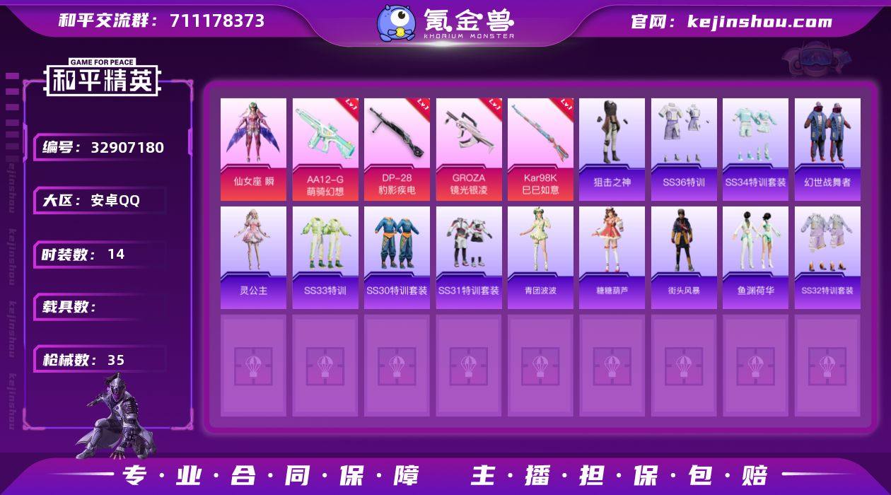 可二次实名【4特效枪1粉装 秒换绑不用等】 安卓Q区-7376热力值-14套装-35枪皮 【1粉装】 角色-仙女座 瞬【4特效枪】 AA12-G-萌骑幻想(3级) Kar98K-巳巳如意(2级) GROZA-镜光银凌(4级) DP-28-豹影疾电(3级)【31热门】 MG3-幻世战舞者 GROZA-福马献瑞 SS34特训 AWM-天降萌叽 SS30特训 青团波波 鱼渊荷华 糖糖葫芦 SS31特训 SS33特训 SS32特训 SS36特训 蜜獾-启元战纹 短管霰弹-星穹咏叹调 G36C-星穹咏叹调 狙击之神 Mk14-薄荷星砂 灵公主 蜜獾-糖糖葫芦 平底锅-糖糖葫芦 野牛-燕燕于飞 UMP45-糖糖葫芦 MK20-H-糖糖葫芦 SPAS-12-燕燕于飞 P18C-糖糖葫芦 Vector-燕燕于飞 蝎式手枪-燕燕于飞 街头风暴 十字弩-燕燕于飞 破片手榴弹-拽到爆炸 P90-巳巳如意【1背包】 糖糖葫芦背包(3级) 营地ID:980297793