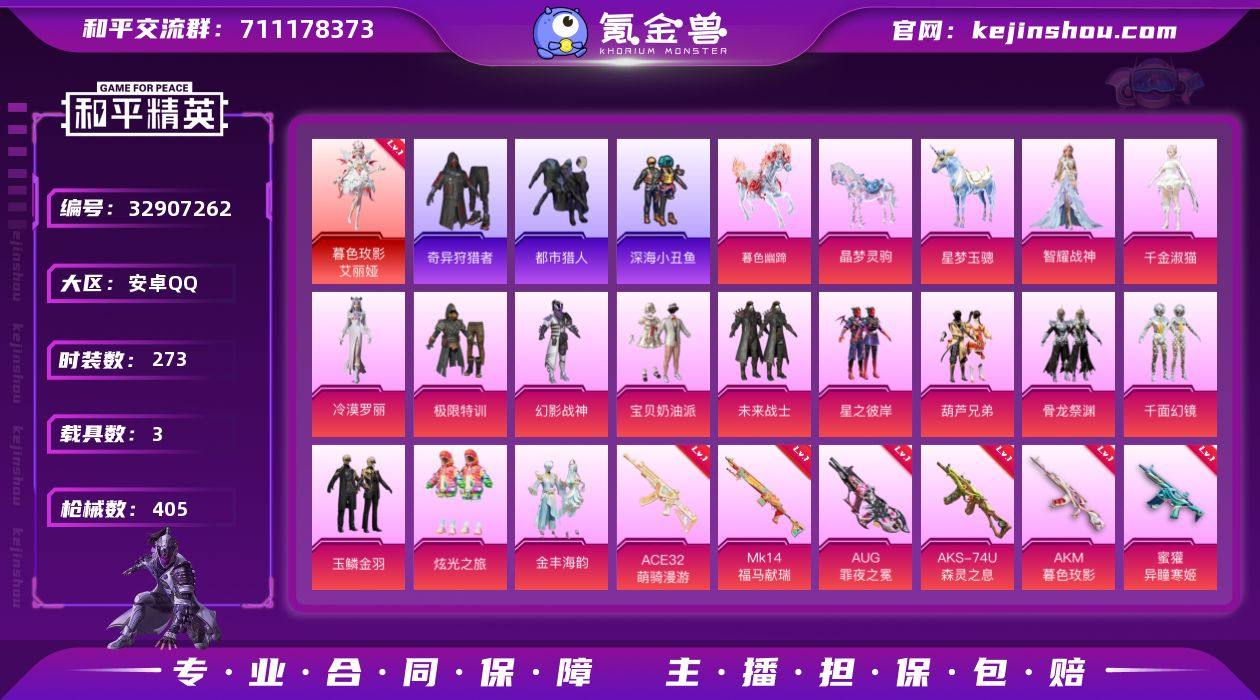 【2级红装都市猎人18特效枪14粉装3载具 秒换绑不用等】 安卓Q区-136441热力值-273套装-405枪皮 【1红装】 暮色玫影-艾丽娅(2级)【3载具】 暮色幽蹄 星梦玉骢 晶梦灵驹【4稀有】 都市猎人 奇异狩猎者 AWM-黄金龙骨 Mark.06蓝螳螂【15粉装】 极限特训 宝贝奶油派 星之彼岸 炫光之旅 葫芦兄弟 骨龙祭渊 千面幻镜(假木乃伊) 玉鳞金羽 幻影战神 未来战士 角色-冷漠罗丽 角色-智耀战神 角色-千金淑猫 金丰海韵【18特效枪】 AKM-幽焰骑士(3级) P90-沙丘之主(3级) M416-心之恋语(7级) AKS-74U-森灵之息(5级) AKM-暮色玫影(2级) AUG-罪夜之冕(5级) Mk14-福马献瑞(5级) ACE32-萌骑漫游(3级) M417-第五大道(6级) M200-玉鳞金羽(7级) AUG-星之彼岸(4级) 蜜獾-异瞳寒姬(4级) Kar98K-巳巳如意(4级) M762-鬼刀(6级) AKS-74U-星穹咏叹调(7级) AUG-暖羊咩咩(5级) DP-28-豹影疾电(5级) 莫辛纳甘-未来领航者(5级)【390热门】 深海小丑鱼 浪漫天命 都市猎人(蓝口罩) 雪山精英(老6服) 小丑鱼 迅捷狂鲨 极速红龙 忍者信条 狂沙舞者 M416-魔法学院 白色伏地魔 SS9特训 SS8特训 SS6特训 SS4特训 SS3特训 SS2特训 SS27特训 SS26特训 SS25特训 SS24特训 SS23特训 SS22特训 S12K-华贵君王 Mini14-梦幻火...