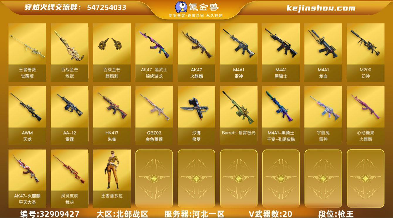 河北一区-22V-2王者-0炫金 【热门武器】:QBZ03-金色蔷薇,HK417-朱雀,M200-幻神,炼狱-迷你小钢,M4A1-黑骑士,羊驼玩偶,沙鹰-修罗*3 【音效卡】:HK417-朱雀音效卡,Barrett-碧霄极光音效卡,麒麟刺-百战金芒-盛典舞曲音效卡,炼狱-百战金芒-庆典舞曲音效卡 【皮肤】:幻神-电竞之星 皮肤,AWM-裁决-凤灵皮肤,雷神-宇航兔皮肤,M4A1-再燃火线,雷神-神秘按键 皮肤,火麒麟-平天大圣*2,火麒麟-心动糖果,M4A1-千变-孔明皮肤,AWM-再燃火线,轻型军用手斧-再燃火线 【角色】:王者潘多拉,乔伊教练,修道士,暗夜-X,芳心审判者,飞虎队-X,风暴女,嘉年华灵狐,灵动武士,灵狐者-X,麻雀,萌儿,潘多拉-X,潘多拉-甜心教官,斯沃特-X,蜀雪,兔囡囡,雪莉杨-摸金校尉,幽 【人偶武器】:炼狱-迷你小钢,AWM-灵狐-15周年嘉年华,黄金迷你深渊冰龙,迷你牛魔王,迷你波特博士,夺魂,深渊终结者手雷 【暴走生化】:超级对讲机 【挑战大师】:AK47-冰龙粉碎者,冰龙粉碎者-白马银枪,激光毁灭者III-白马银枪*2,激光毁灭者III,神圣爆裂者-末日III 【英雄级武器】:AK47-火麒麟,M4A1-雷神,M4A1-黑骑士,M4A1-龙血,HK417-朱雀,黑武士-锦绣游龙,QBZ03-金色蔷薇,AWM-天龙...