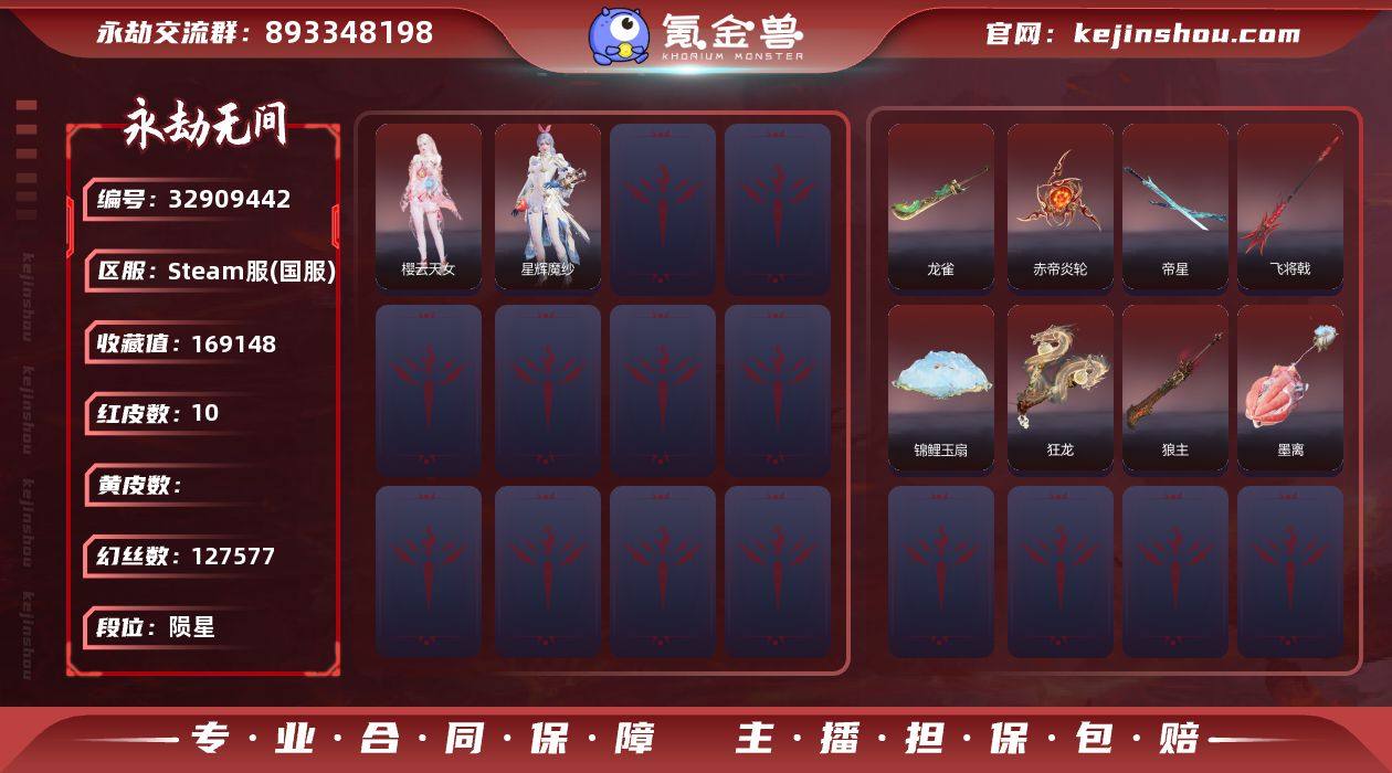 WJ5742,steam端游,可换绑,三人段位陨星2,声望4,10红,204金,等级249,收藏值169148,幻丝127577,金砖78,通行证Lv43,变身器,荆魂,红色神品,墨离,星辉魔纱,樱云天女,赤帝炎轮,龙雀,狼主,飞将戟,锦鲤玉扇,狂龙,帝星,角色金色皮肤,赤丹朱湛,麟鹿大铠,玉叶景,干将莫邪,春不敛,赤阳天狐,妲己,云中君,代号玉脍,逆水寒极夜天曦,赤诚心,姜子牙,怀金袍,云间影,赤焰战灵,天虹咏,传蓝兔,瑶光沐月,昆仑之主,巨阙,日道神子,御宅罗梦,清雅少女,碧水青天,妖刀姬,百战破荆者,汉光,申公豹,紫微星命,龙吉公主,武器金色皮肤,咕咕,天牛翼,沉默审判,戏祥云,石中火,天心玉,诡刃八岐,天狐,青石猊,破天,听涛,断月影,麒麟牙,