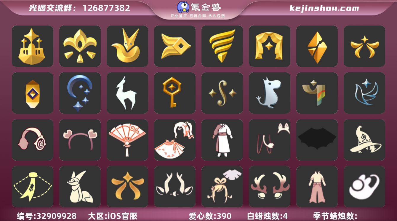 账号类型: 手机账号 季节已毕业: 梦想季,小王子季,风行季,潜海季,表演季,破晓季,欧若拉季,集结季,夜行季,追忆季,九色鹿季,筑巢季,二重奏季,姆明季,彩染季,青鸟季 完成地图: 晨岛,云野,雨林,霞谷,暮土,禁阁 珍稀物品: 白枭,透明蝶翼斗,玫瑰花 礼包: 蝙蝠套,巫师,围巾,小狐狸,欧若拉之翼,九色鹿角,绊爱,鹿角,牛仔裤,兔子鞋,运动鞋,秋千,茶桌,瑞雪,福娃,跷跷板,吉他,灯笼,绒帽,橘子,贝壳,兔子,南瓜,雪花,水母,彩虹耳钉,彩虹耳机,新年裤,四叶草,暗彩装扮,新年耳钉,创始人,海蓝波浪发型,日光耳环,姆明饰品套装,龙鳞束身长袍,衔福献瑞礼包,献瑞折扇礼包,心心相印发饰礼包,云音伴游耳机 裤子: 武士裤,背带裤,搓澡巾,击剑裤,妮妮裙子,王子服,蓝绿裤,飞天裤,筑巢季·裤子,青鸟尊贵蓬头裤子 面具: 凤凰面具,贴花面具,呼吸面具,夜行毕业面具,黄眉企鹅面具,辉光羚羊面具 面饰: 红耳机,黑框眼镜,青鸟毕业面饰 项链: 围巾 发型: 若笠,虚荣,单侧绑发,小王子发型,留辫蘑菇头,飞天盘发,海蓝波浪发型 头饰: 行军锅头盔,羽毛发饰,蓝色音乐会,平顶帽 斗篷: 海洋斗,蟑螂斗,绿芽,粉红绒毛斗篷,遥鲲斗篷,黄色连帽披风,燕尾斗篷,冥龙斗篷,彩染围巾斗篷,玫瑰褶边斗篷,青鸟毕业斗篷 配饰: 雨伞,筑巢季·小...