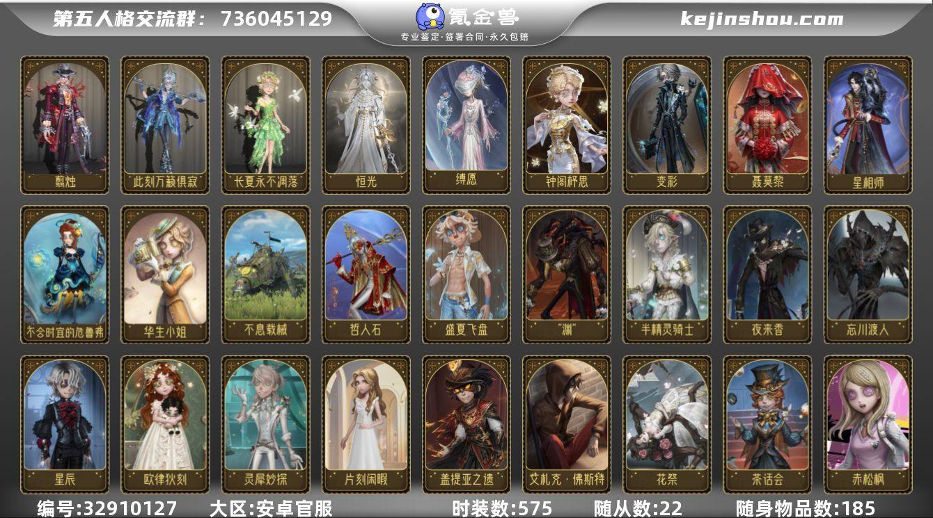 账号类型: 邮箱账号 时装数: 575 时装: 病患-星辰,厂长-“驯服”,“噩梦”-“渊”,红蝶-仙鹤,红蝶-彼岸,红夫人-最后一舞,“杰克”-绿纹大触,“杰克”-忘川渡人,“杰克”-夜来香,机械师-归来者,昆虫学者-动植物学教授,盲女-海西遗风,梦之女巫-纸皇后,前锋-坂本龙司,前锋-SKULL,“囚徒”-电解,“囚徒”-灵犀妙探,“囚徒”-冬蝉,宿伞之魂-残花泪,摄影师-月下绅士,摄影师-宿醉,调香师-笼中之蝶,调香师-致命温柔,舞女-高卷杏,舞女-“月佑者”,“小女孩”-年岁,园丁-罗刹绯春,佣兵-思明,邮差-“亡灵”,蜘蛛-时之猎手,蜘蛛-花祭,杂技演员-雨宫莲,杂技演员-ACE,杂技演员-茶话会,空军-爱神之吻,守墓人-半精灵骑士,“杰克”-艾札克·佛斯特,“囚徒”-天海兰太郎,“小女孩”-欧律狄刻,记者-赤松枫,小说家-最原终一,心理学家-神圣阿斯莫,心理学家-长夜,鹿头-镏金铜鹿,调酒师-夜光杯,隐士-首席顾问,画家-温暖的平安夜,守夜人-KNIGHT-c3,拉拉队员-BISHOP-f1,勘探员-盖提亚之遗,爱丽丝·德罗斯-片刻闲暇,小提琴家-不羁的浪漫,隐士-升学礼,蜘蛛-墨卡托投影,佣兵-布朗熊,歌剧演员-幕外之音,小丑-捣蛋裘克,“慈善家”-斗牛士之吻,摄影师-梦境大耳狗,渔女-百万人鱼,教授-紧急运输,先知-纯白之盐,调酒师-逐浪的玫瑰,勘探员-盛夏飞盘,...