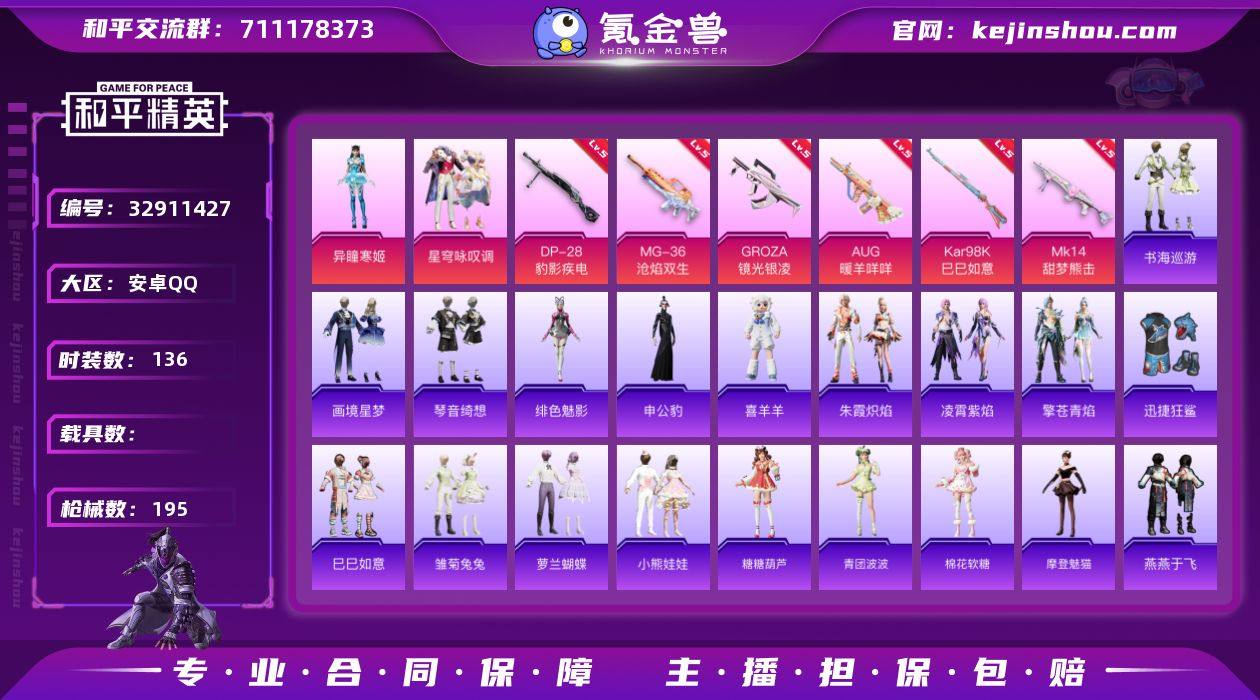 【kyhp205】安卓 手Q-2粉装-7特效枪-0载具-2粉色飞行器-54563热力值-10王牌印记-136套装-195枪皮 【粉色套装】:粉装-星穹咏叹调,角色-异瞳寒姬 【粉色枪皮等级】:GROZA-镜光银凌(五级),AUG-暖羊咩咩(五级),AKS-74U-森灵之息(五级),Kar98K-巳巳如意(五级),Mk14-甜梦熊击(五级),DP-28-豹影疾电(五级),MG-36-沧焰双生(五级) 【粉色枪皮】:GROZA-镜光银凌,AUG-暖羊咩咩,AKS-74U-森灵之息,Kar98K-巳巳如意,Mk14-甜梦熊击,DP-28-豹影疾电,MG-36-沧焰双生 【粉色飞行器】:星之彼岸飞行器 【粉色降落伞】:绝对恒星降落伞,繁花小夜曲降落伞,星之彼岸降落伞,千金淑猫降落伞,临安公主降落伞,智耀战神降落伞,喜羊羊与灰太狼降落伞,异瞳寒姬降落伞,炫彩糖果降落伞 【稀有套装】:套装-巳巳如意,套装-炫彩糖果,套装-雏菊兔兔,套装-萝兰蝴蝶,套装-小熊娃娃,套装-糖糖葫芦,套装-青团波波,套装-棉花软糖,角色-摩登魅猫,套装-燕燕于飞,套装-鱼渊荷华,角色-蜜桃派对,套装-紫幽梦,套装-蓝冰羽,套装-星影赞美诗,套装-星渊小夜曲,角色-时希公主,套装-朱霞炽焰,套装-凌霄紫焰,套装-擎苍青焰,玩偶服-喜羊羊,角色-申公豹,角色-绯色魅影,套装-书海巡游...