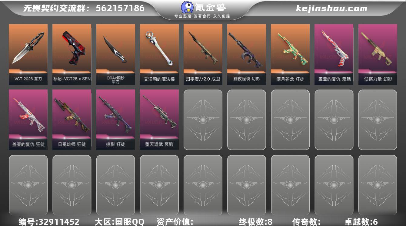 【套装】:VCT 2026 赛季套装 【英雄】:炼狱,暮蝶,捷风,不死鸟,贤者,猎枭,芮娜 【近战武器】:近战武器-VCT 2026 篆刀,近战武器-ORA x 颗秒 军刀,近战武器-艾沃莉的魔法棒,近战武器-个人近战单位 【狂徒】:狂徒-偃月苍龙,狂徒-掠影,狂徒-盖亚的复仇,狂徒-日冕雄师 【幻影】:幻影-黯夜怪谈,幻影-侦察力量 【戍卫】:戍卫-归零者//2.0 【冥驹】:冥驹-堕天遗武 【VCT手枪】:标配-VCT26 x SEN 【鬼魅】:鬼魅-盖亚的复仇 【卡面】:梦幻奶茶 卡面,清除名单 卡面,无畏契约GO!第一卷:零 卡面,代号红色 卡面,新兵报到 卡面,V契约 卡面,无畏契约 卡面 【喷漆】:新潮流 喷漆,买装还是存钱 喷漆,关门放狗 喷漆,胜利属于无畏契约 喷漆,GLHF 喷漆,无畏契约 喷漆 【挂饰】:鱼骨头 挂饰,瞬云履 挂饰,第八季//第二幕 纪念币 挂饰 ,天外飞客 挂饰,无畏契约 纪念币 挂饰