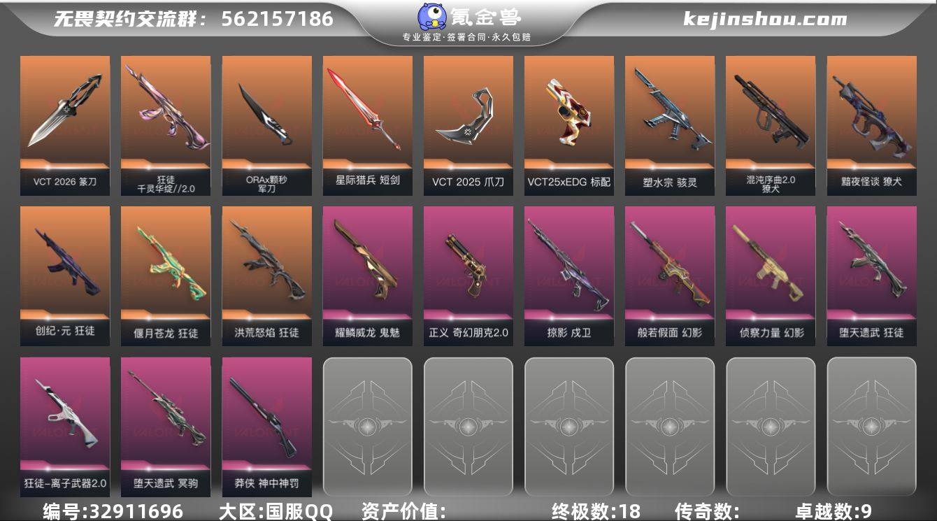 段位: 白银 套装: VCT 2025赛季礼包 近战武器皮肤: VCT 2025 爪刀,星际猎兵 短剑,ORAx颗秒 军刀,VCT 2026 篆刀 步枪皮肤: 狂徒-偃月苍龙,幻影-侦察力量,狂徒-堕天遗武,狂徒-洪荒怒焰,幻影-般若假面,獠犬-黯夜怪谈,戍卫-掠影,狂徒-创·纪元,狂徒-离子武器2.0,獠犬-混沌序曲2.0,狂徒-千灵华绽//2.0 佩枪皮肤: 鬼魅-耀鳞威龙,标配-VCT25xEDG,正义-奇幻朋克2.0 狙击枪皮肤: 冥驹-堕天遗武,莽侠-神中神罚 冲锋枪皮肤: 骇灵-塑水宗 亮点: 【WWZG448】终极*18/卓越*9/皮肤*72/等级*98/段位:白银/VCT 2026 赛季套装/回火礼包// V25套装/VCT 2025赛季礼包/幻棱/炼狱/维斯/暮蝶/钛狐/壹决/铁臂/捷风/雷兹/幽影/不死鸟/贤者/猎枭/蝰蛇/零/芮娜/奇乐/尚勃勒/霓虹/斯凯/夜露/星礈/K/O/海神/盖可/黑梦/钢锁/近战武器-碎心裂刃/VCT 2026 篆刀/ORAx颗秒 军刀/影钩/VCT 2025 爪刀/黑波之刃/天玄刀/天御刀/星际猎兵 短剑/狂徒-洪荒怒焰/狂徒-偃月苍龙/狂徒-创·纪元/狂徒-千灵华绽//2.0/狂徒-堕天遗武/狂徒-离子武器2.0/幻影-般若假面/幻影-侦察力量/戍卫-掠影/獠犬-黯夜怪谈/獠犬-混沌序曲2.0/冥驹-堕天遗武/莽侠-神中神罚/骇灵-塑水宗/骇灵-无限竞技/标配-VCT25xEDG/正义-奇幻朋克2.0/鬼魅-耀鳞...