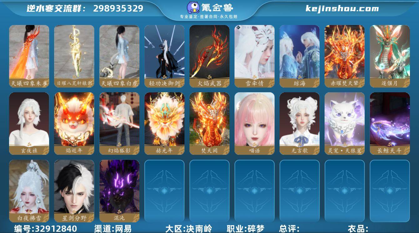 【已用天赏44-转盘1】战力值:2043159 总评:2043159 角色等级:89 衣品值: 353720 国色值: 146270 已用天赏石:44 天霓染数量:7 【网易手机账号】 【无换绑冷却】 【碎梦】 【男】 【7级】 【卧看千山】 【互通】 转盘外观1 副本外观4 天赏外观14 天赏祥瑞5 天赏灵宠1 武器环身4 转盘外观:星喵梦使; 副本外观:白夜拂雪,混沌,芜心照雪,星剑分野; 天赏外观:玄夜旌,无言歌,喵语,琼海,雪牵情,水武器,火焰武器,幻焰狐影,机械武器,轻功诀御剑,明河曙天·长鲸天斗,天曦四象·白虎,绝技日曜八荒·轩辕剑,绝技天曦四象·朱雀; 天赏祥瑞:赫光年,赤曜焚天辇,逐偃月,焚天阙,焰巡年; 天赏灵宠:灵宠·天狼星; 武器环身:灵息环流,天下不服,振金雷,渊墟深影;