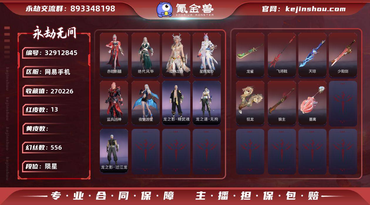 WJ5736,网易手机,4月11可换绑,三人段位陨星2,声望4,13红,467金,等级366,收藏值270226,幻丝556,金砖82,通行证Lv152,变身器,揽九天,镇冥司,珥冰,荆魂,应龙号,红色神品,墨离,绝代风华,监兵凶神,夜魅游莹,星辉魔纱,赤皓新囍,泣珠龙纱,龙雀,狼主,飞将戟,少阳剑,天琼,狂龙,角色金色皮肤,剪春漪,姑射真人,祸津素盏,赤焰舞影,倾闭月,玉叶景,胡旋女,青鸟,龙门飞天,不败擂主,秋神蓐收,悟空,冬无归,干将莫邪,冬神玄冥,幽夜玲珑,春不敛,黄昏巫主,秋藏桂,绮云衫,腓腓,夜绸袍,黑猫警长班长制服,文鳐,赤诚心,孤影戎装,云间影,赤焰战灵,暖冬茶馨,精武魂,无拘,过江龙,千钧羽,断月影,朱明,仙彩,灵木角,海神三叉戟,金神钺,长虹,建木,白虹,封魔,学宫之杖,倒马棍,2674超越型,道诡异仙七星铜钱剑,财神剑,隐锋,2674贰型电浆杖,糖衣甜心,曼提柯尔之牙,桡尺刀,仙舞,马首刀,青峰叠扇,耀夜流华,樱落,叶底花,千堆雪,