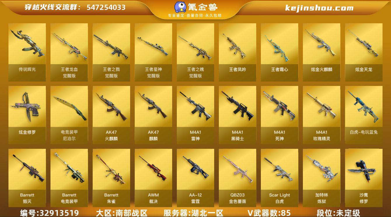 实名: 可修改 排位资格: 有 V武器: AK47-火麒麟,AK47-麒麟,M4A1-雷神,M4A1-黑骑士,M4A1-死神,M4A1-玫瑰精灵,Barrett-毁灭,Barrett-电竞装甲,Barrett-朱雀,AWM-裁决,AA-12-雷霆,QBZ03-金色蔷薇,Scar Light-白虎,加特林-炼狱,沙鹰-修罗,沙鹰-天神,屠龙,龙啸,麒麟刺,Barrett-暗月传说,柯尔特-电竞装甲,AK-47-猩红传说,传说辉光,白虎-电玩蓝兔,尼泊尔-电竞装甲 王者武器: 王者霜心,王者凤吟,王者之魄-觉醒版,王者星神-觉醒版,王者之戮-觉醒版,王者龙血-觉醒版,王者M200-无畏金戈 炫金武器: 炫金火麒麟,炫金天龙,炫金修罗 热门武器: Knife-冠军之刃 狙击枪稀有皮肤: 毁灭-荣耀之怒 英雄角色: 樱,雨棠,鹰,荒漠琉璃,月兔特工 音效道具: M4A1-黑骑士音效卡 亮点: 【优质装备】:传说辉光,QBZ03-金色蔷薇,白虎-电玩蓝兔,M4A1-黑骑士音效卡,AK47-火麒麟,AK47-麒麟,M4A1-雷神,M4A1-黑骑士,M4A1-死神,M4A1-玫瑰精灵,Barrett-毁灭,Barrett-电竞装甲,Barrett-朱雀,AWM-裁决,AA-12-雷霆,Scar Light-白虎,加特林-炼狱,沙鹰-修罗,沙鹰-天神,屠龙,龙啸,麒麟刺,Barrett-暗月传说,柯尔特-电竞装甲,尼泊尔-电竞装甲