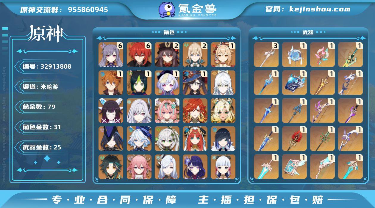 60级/79黄/男主/31个五星角色/25个五星武器 0命克洛琳德,0命芙宁娜,0命迪希雅,0命纳西妲,0命妮露,1命提纳里,0命夜兰,0命八重神子,0命申鹤,0命雷电将军,0命枫原万叶,0命神里绫华,0命钟离,2命胡桃,0命甘雨,0命魈,1命宵宫,0命温迪,0命可莉,1命达达利亚,满命刻晴,1命七七,2命琴,1命莫娜,满命迪卢克,0命希诺宁,0命玛薇卡,0命瓦雷莎,0命丝柯克,0命哥伦比娅,0命兹白,精1静水流涌之辉,精1万世流涌大典,精1圣显之钥,精1若水,精1波乱月白经津,精1息灾,精1飞雷之弦振,精1雾切之回光,精1松籁响起之时,精1护摩之杖,精1四风原典,精1和璞鸢,精1天空之翼,精1阿莫斯之弓,精1天空之刃,精1天空之卷,精3风鹰剑,精1天空之傲,精1山王长牙,精1溢彩心念,精1帷间夜曲