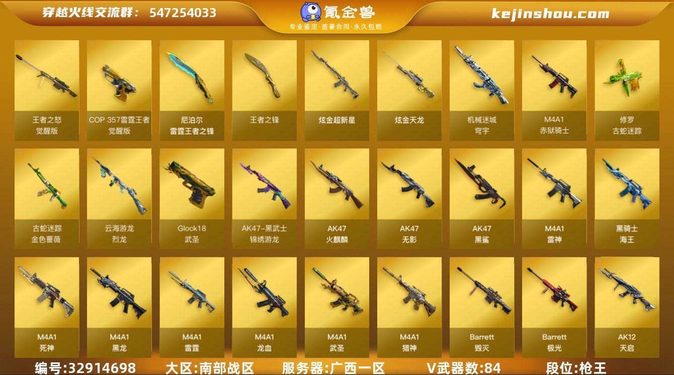 【ky6598】广西一区-93V-9王者武器数-5炫金武器数 【热门武器】:QBZ03-金色蔷薇,金色蔷薇-古蛇迷踪,修罗-古蛇迷踪,死亡之眼,汤姆逊-烈龙,加特林-炼狱,沙鹰-修罗,炽芒蝶刃 【王者炫金武器】:王者之锋,雷霆王者之锋,高爆手雷-雷霆王者*2,炫金超新星*2,炫金天龙*3 【音效卡】:M4A1-雷神-云海游龙音效卡,Barrett-碧霄极光音效卡*2 【皮肤】:金色蔷薇-电竞之星 皮肤,雷神-星空,雷神-源计划2.0专属 皮肤,毁灭-暗月,毁灭耀金皮肤,毁灭-英雄计划 皮肤,无影-暗月,死神-机甲核心皮肤,擎天-蒸汽钟表 皮肤 【角色】:零,炫,战地猎狐,蛇隐宗,乔伊教练,修道士,云海玲珑,幻面灵狐,暗夜-X,初恋灵狐,电竞少女,飞虎队-X,风暴女,嘉年华灵狐,娟娟,兰-新年限定,0号玩家,零-水下丽影,龙儿,麻雀,萌儿,潘多拉-X,潘多拉-甜心教官,潜龙队-X,青霞仙子,蛇姬,铁骑荣耀,维纳斯,新娜塔莎,雪莉杨,夜玫瑰-宠粉,樱-战斗天使,影武者-X,游珑儿,智影,潘多拉-N 【人偶武器】:AWM-灵狐-15周年嘉年华,迷你牛魔王,迷你波特博士,迷你牛牛,深渊终结者手雷,迷你艾比,沙鹰-夜玫瑰,灵狐娃娃手雷 【暴走生化】:死亡之眼,超级对讲机 【挑战大师】:冰龙...
