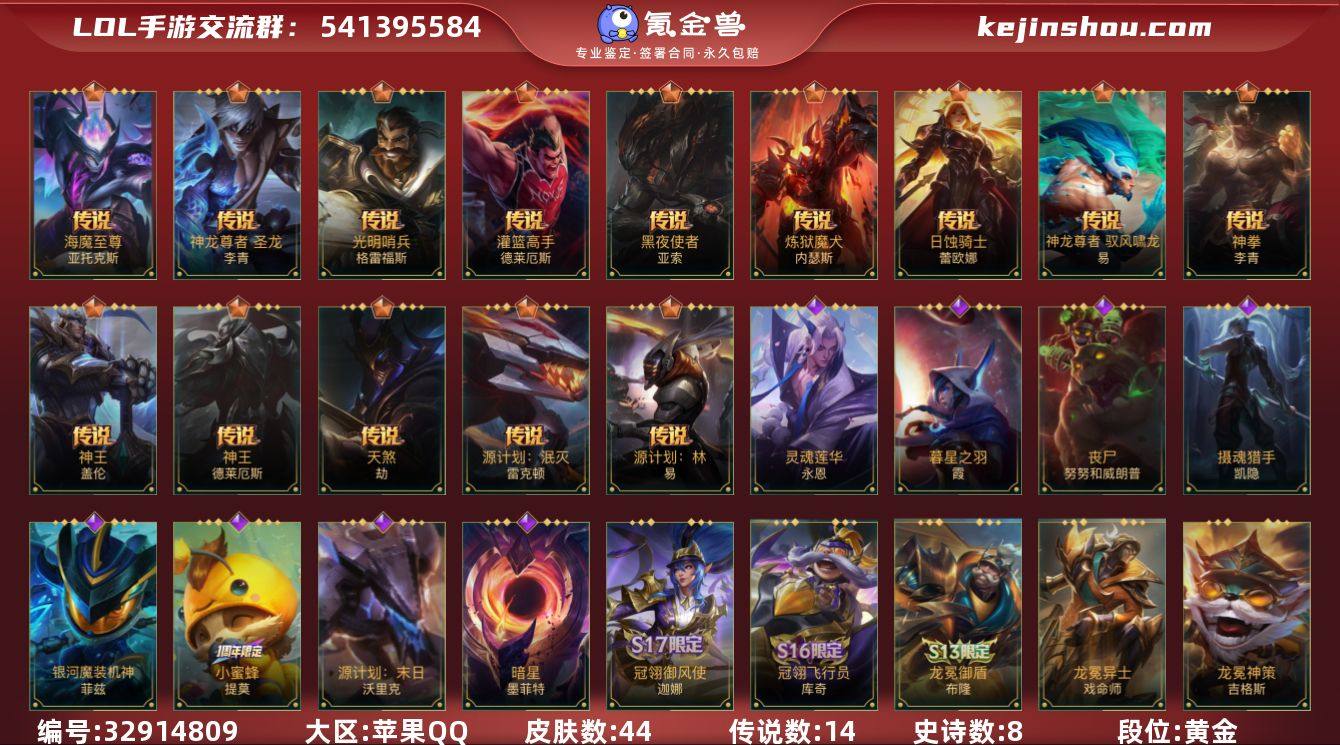 实名: 可修改 段位: 黄金 皮肤数: 44 传说皮: 灌篮高手,黑夜使者亚索,炼狱魔犬,日蚀骑士蕾欧娜,神龙尊者 驭风啸龙,神拳盲僧,神王盖伦,神王诺手,天煞劫,源计划:林,源计划:泯灭,光明哨兵格雷福斯,神龙尊者 圣龙 李青,海魔至尊 亚托克斯 亮点: 【优质装备】:灌篮高手,黑夜使者亚索,炼狱魔犬,日蚀骑士蕾欧娜,神龙尊者 驭风啸龙,神拳盲僧,神王盖伦,神王诺手,天煞劫,源计划:林,源计划:泯灭,光明哨兵格雷福斯