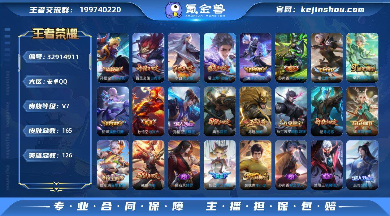 实名: 可修改 性别: 女号 贵族等级: V7 英雄数: 126 皮肤数: 165 荣耀水晶: 全息碎影 传说皮: 云鹰飞将,猫影幻舞,末日机甲-孙尚香,地狱火,山海·苍雷引,澜逐花归海 限定皮: 李小龙,梁祝,岱宗,神威,时之彼端,飞衡,凤求凰,白虎志,青龙志,至尊宝,如梦令-后羿,鸣野蒿 亮点: 【优质装备】:全息碎影(猴子典藏),云鹰飞将(小将军),猫影幻舞,末日机甲-孙尚香(绿蚂蚱),地狱火,山海·苍雷引(电光曜子),澜逐花归海