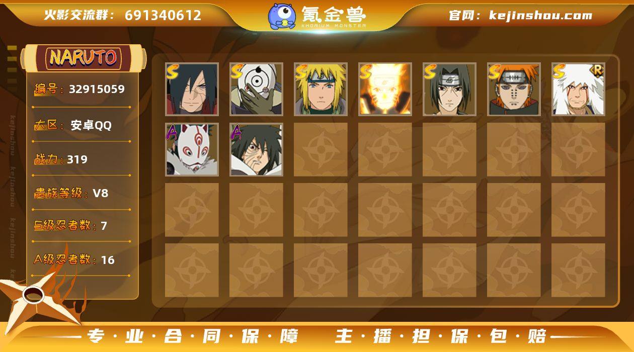 HY21969|【可实名】可二次 319w战力 v8 安卓QQ 3620区 S忍者数:7 A忍者数:16 时装5安卓QQ 3620区 S忍者数:7 A忍者数:16 忍者:宇智波斑「秽土转生·解」,漩涡鸣人「九喇嘛连结」,自来也「舞之豪杰」,宇智波斑「白面具」,宇智波鼬「须佐能乎」,佩恩「天道」,波风水门,小南「神驹佑将」,机械鸣人「初始形态」,宇智波泉奈,漩涡博人「桃式显现」,小南「漂泊浪客」,日向宁次「忍界大战」,神秘面具男「忍者之路」,黑土「四代目土影」,迪达拉「秽土转生」,宇智波带土「暴怒」,宇智波佐助「万花筒写轮眼」,迪达拉,我爱罗「疾风传」,蝎,干柿鬼鲛,宇智波鼬,佩恩「畜生道」,重吾「忍界大战」,御手洗红豆「新春限定」,佩恩「饿鬼道」,佩恩「人间道」,枫「新佩恩六道」,萨姆伊「新春限定」,贰「火之意志继承者」,春野樱「忍者少女」,油女取根,惠比寿,卯月夕颜,木叶丸「疾风传」,自来也「木叶三忍」,宇智波佐助「新春限定」,天天「疾风传」,山中井野「疾风传」,宇智波佐助「疾风传」,春野樱「疾风传」,漩涡鸣人「疾风传」,君麻吕,御手洗红豆,白,左近右近「秽土转生」,山城青叶,鬼童丸「秽土转生」,水木「咒印」,金槌,钢子铁,萨克镫,漩涡鸣人「忍者学员」,日向花火,手鞠「镰多利」,多由也,左近...