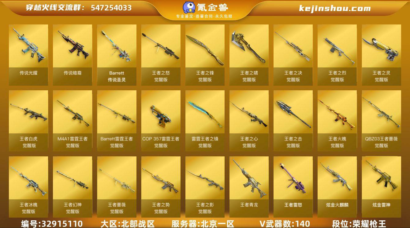 【ky6599】北京一区-183V-36王者武器数-8炫金武器数 【传说武器】:传说光耀,传说暗裔,传说圣灵 【传说角色】:传说女帝 【热门武器】:传说光耀,传说暗裔,传说圣灵,QBZ03-金色蔷薇,Scar Light-白虎,HK417-朱雀,M4A1-青龙,M200-幻神,M200-竞技荣光,死亡之眼,Kar98K-星神,M4A1-黑骑士*5,汤姆逊-烈龙*7,RPK-盘龙*7,加特林-炼狱,斯泰尔-蝴蝶,羊驼玩偶,雷神-小红,USP-雷暴,COP-堕天神*2,COP 357-幻灵*3,沙鹰-修罗*4,黄金猫猫手套-白鲨,金刚伞 【王者炫金武器】:王者青龙,王者雷怒,高爆手雷-雷霆王者,炫金火麒麟,炫金骑士,炫金黑龙*2,炫金雷神,炫金超新星,炫金毁灭,炫金修罗 【音效卡】:M200-幻神音效卡,AK47-火麒麟音效卡,M4A1-雷神音效卡,M4A1-黑龙音效卡,M4A1-黑骑士音效卡,Barrett-毁灭音效卡,Barrett-极光音效卡,AWM-裁决音效卡,Scar Light-白虎音效卡*2,绝迹语音包 【皮肤】:幻神-周瑜皮肤,幻神-AG-CFPLS17冠军,雷神-虎将,雷神-冠军之魄,雷神-杨戬,雷神-烈虎皮肤,火麒麟-华夏之心,传奇石头-横秒之巅,火麒麟-平天大圣,火麒麟-盘古,毁灭耀金皮肤,毁灭-CFS2020,毁灭-黑大圣皮肤*2,毁灭-风暴*2,毁灭-英雄计划 皮肤...