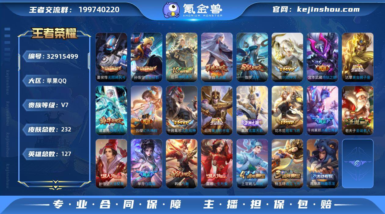 苹果Q 可二次 2典藏15传说127英雄232皮肤 无限飓风号 全息碎影 凤求凰 神树通天 幻光神枪 愿照众生和 玄雷天君 时雨天司 太华 零号赤焰 炽阳神光 久胜战神 冠军飞将 黄金狮子座 黄金射手座 地狱之眼 末日机甲女 涂山容容 时雨天司 山海玄木吟 太华 飞衡 霸王别姬女 霸王别姬男 默契交锋女 大圣娶亲 一生所爱 白晶晶 冰霜恋舞曲 圣诞老人 猎兽之王 星空之诺 银河之约 原初追逐者 黎明之约 死神来了 梁祝 狂想玩偶喵 云间偶戏 电玩小子 龙骑士 黄忠百相守梦 灵蛊蚀心 真我赫兹百里 原初探秘者 水晶猎龙者 暗隐猎兽者 猫狗日记男 金属风暴 地狱岩魂 白昼王子 王者荣耀账号