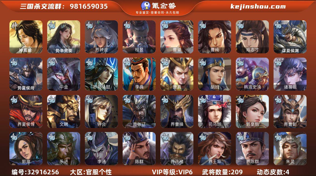 官阶:领军将军;VIP等级:VIP6;史诗武将数量:12;动态皮肤数量:4;武将总数:209;史诗宝珠数量:0;将魂数量:2748;神将:0;魏国史诗武将:0;蜀国史诗武将:3;吴国史诗武将:2;群史诗武将:1 界钟会,曹婴,曹纯,戏志才,势辛宪英,程昱,沙摩柯,谯周,花鬘,吴景,界朱然,刘焉,神周瑜,势夏侯尚,SP关羽,SP蔡文姬,乐进,曹昂,诸葛诞,朱灵,文聘,SP姜维,钟会,曹冲,郭淮,满宠,界王异,界曹操,界司马懿,界夏侯惇,界张辽,界许褚,界郭嘉,李典,曹真,韩浩史涣,陈群,曹叡,钟繇,司马朗,李通,郭皇后,张恭,界曹彰,卞夫人,界陈群,蔡贞姬,崔琰,胡班,谋夏侯渊,牛金,唐咨,势陈到,SP孙尚香,夏侯霸,马良,关兴张苞,廖化,界马岱,关平,刘封,界法正,界关兴张苞,界刘备,界关羽,界赵云,界马超,SP徐庶,吴懿,周仓,张松,马忠,界黄月英,界伊籍,界庞统,胡金定,张翼,杨仪,界简雍,彭羕,谋庞统,界张嶷,诸葛果,蒋琬费祎,糜芳傅士仁,甘夫人,势陈祗,鲁肃,凌操,诸葛瑾,孙鲁育,程普,韩当,潘璋马忠,虞翻,朱然,界甘宁,界黄盖,界周瑜,界大乔,界陆逊,孙鲁班,朱桓,顾雍,朱治,全琮,界孙尚香,潘濬,孙翊,吕范,界顾雍,谋周瑜,谋小乔,张布,伏完,界袁术,张宝,伏皇后,李儒,华雄,袁术,界华佗,公孙瓒,蔡夫人,公孙渊,郭图逢纪,SP黄月英,刘虞,界庞...