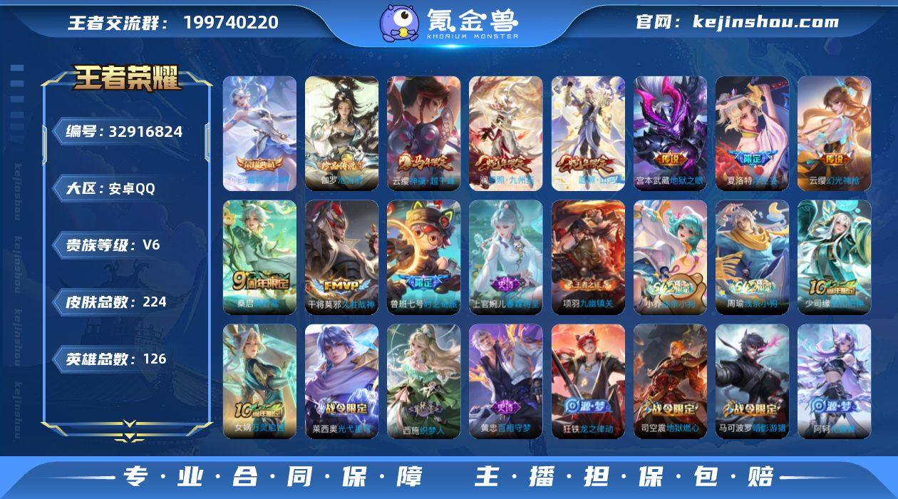 【mwz346】安卓Q-V6-最强王者段位-126英雄-224皮肤-1典藏皮肤-1珍品传说-9传说-46史诗 【英雄全皮】:孙权全皮,司空震全皮 【荣耀典藏】:伽罗最初的交响 【珍品传说】:伽罗沧流箭 【传说皮肤】:云缨神骥越千峰,司空震愿照山河定,澜愿照九州拓,云缨幻光神枪,桑启鸣野蒿,鲁班七号时之奇旅,夏洛特浮生妄,干将莫邪久胜战神,宫本武藏地狱之眼 【限定皮肤】:虞姬夏日便利店,姜子牙天穹之誓,杨戬破阵退雄兵,狄仁杰阴阳师,赵云皇家上将,孙尚香蔷薇恋人,鲁班七号时之奇旅,马可波罗暗影游猎,狄仁杰魔术师,达摩沙漠行僧,项羽海滩派对,兰陵王金庭之子,李元芳云中旅人,鬼谷子五谷丰年,百里玄策原初追逐者,沈梦溪大漠名商,裴擒虎擒涛扼浪,米莱狄胡桃异想国,上官婉儿梁祝,鲁班大师探海日志,桑启海盐诗旅,夏洛特浮生妄,艾琳流音漫舞,司空震地狱燃心,阿古朵江河有灵,张良古海寻踪,鬼谷子天穹祈灯,姬小满妄想食味,沈梦溪龙舞盛年,刘邦剑破天穹,程咬金群星魔术团,周瑜熔金海岸 【年限皮肤】:司空震愿照山河定,澜愿照九州拓 【赛季限定】:达摩沙漠行僧,兰陵王金庭之子,沈梦溪大漠名商,李元芳云中旅人,桑启海盐诗旅,裴擒虎擒涛扼浪,鲁班大师...
