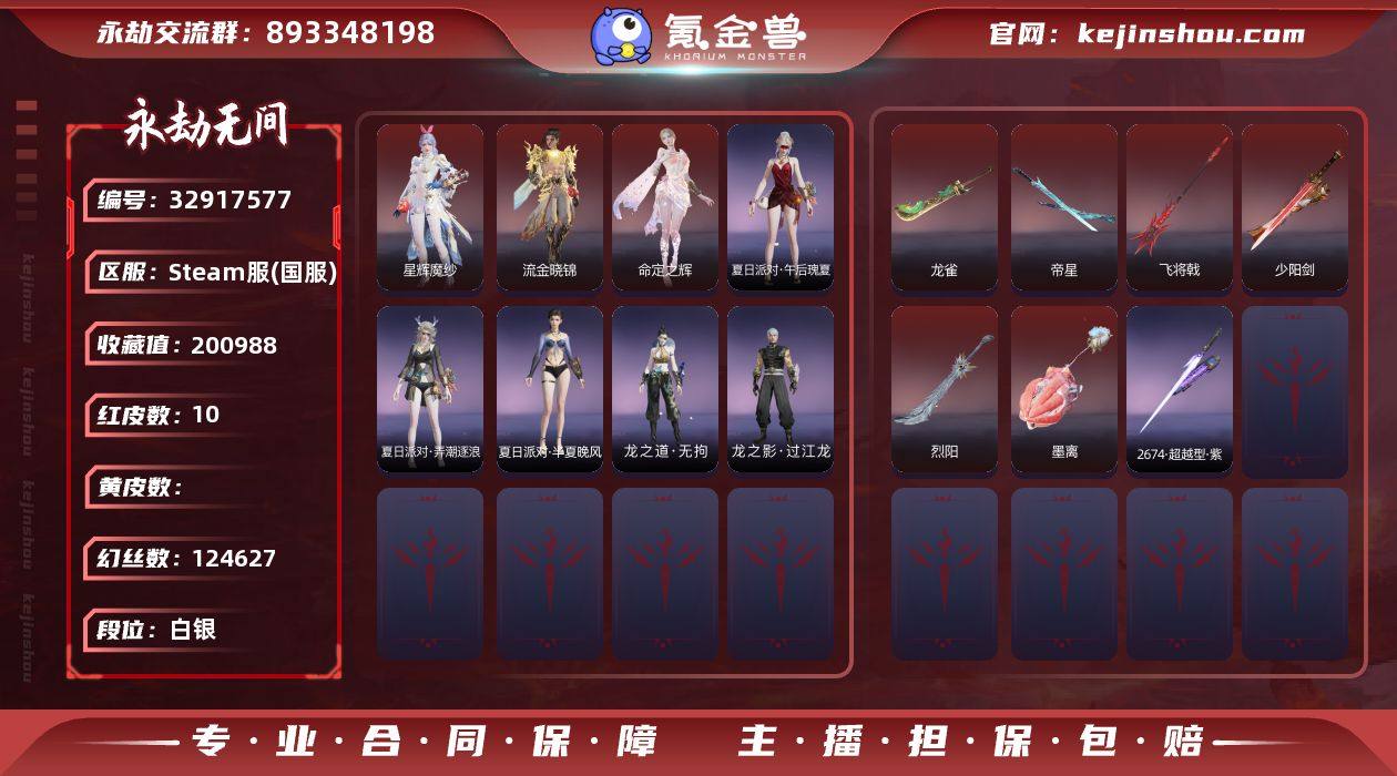 WJ5752,steam端游,可换绑,三人段位白银1,声望34,10红,321金,等级320,收藏值200988,幻丝124627,金砖50,通行证Lv87,变身器,凶虎,守望先锋DVa战斗机甲,珥冰,炎烈珠,荆魂,神君印,红色神品,墨离,星辉魔纱,流金晓锦,命定之辉,龙雀,烈阳,飞将戟,少阳剑,帝星,2674超越型紫,,角色金色皮肤,剪春漪,自动人形A2,凤凰装,凛冬,青鸟,火罗圣女,浣烟纱,瀚海苍鹰,不败擂主,秋神蓐收,冬无归,持国天王,冬神玄冥,幽夜玲珑,春不敛,黄昏巫主,涂鸦少女,绮云衫,腓腓,夜绸袍,半夏晚风,正法袍,暖冬茶馨,墨游痕,少林,福寿仙,鹅黄纱梦,萍之缘,多闻天王,唐三,炽羽,信手斩龙,江海沧澜,承云兰寿,夜华朝,午后瑰夏,弄潮逐浪,无拘,过江龙,学宫之杖,打狗棒,2674超越型,财神剑,隐锋,监星尺,2674猎刃,曼提柯尔之牙,桡尺刀,仙舞,青峰叠扇,耀夜流华,逍遥,夔牛槌,月瞳,嘶风,镇魔杵,精武,胧夜狐影,祸忌,蝴蝶心,曜金紫珀,光影裁决,螭龙,衔月,水衡,月光与黑暗,劫烬炼,壶中日月,含光承影,素霓,霜素,切影,疑梦,数珠丸,烛泪,