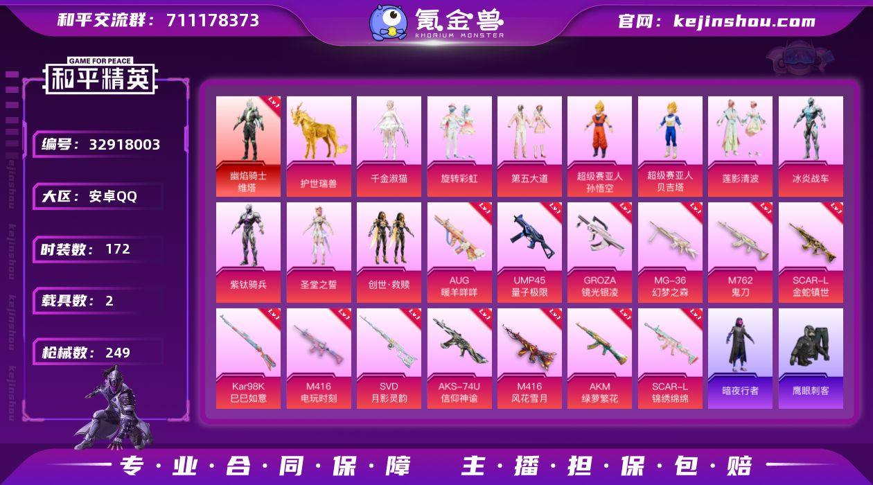 【2级维塔金鞋8粉装13特效枪2载具秒换绑】 安卓Q区-78765热力值-13印记-172套装-249枪皮 【1红装】 幽焰骑士-维塔(2级)【2载具】 路特斯EL蓝色 护世瑞兽【3稀有】 8号机 Mark.06 派对舞王【8粉装】 圣堂之誓 冰炎战车 紫钛骑兵 第五大道 莲影清波 旋转彩虹 创世·救赎 角色-千金淑猫【13特效枪】 SCAR-L-锦绣绵绵(5级) M416-风花雪月(7级) AKM-绿萝繁花(5级) MG-36-幻梦之森(1级) M416-电玩时刻(5级) UMP45-量子极限(5级) GROZA-镜光银凌(5级) AKS-74U-信仰神谕(2级) Kar98K-巳巳如意(5级) AUG-暖羊咩咩(5级) M762-鬼刀(1级) SVD-月影灵韵(3级) SCAR-L-金蛇镇世(3级)【51热门】 M416-蓝色火焰 GROZA-彩虹符号 QBZ-银碳小老虎 M762-暗夜鎏金 长空猛禽 虚音幻奏 甜心亚梦 甜蜜熊情侣 圣堂之誓 牛气冲天 霓虹街区 妙红点点 懵萌河马 S686-奇异狩猎者 风暴特警 浪漫天命 雪山精英(老6服) 鹰眼刺客 暗夜行者 小丑鱼 暗影哥特(红眼罩) 银碳小老虎 狂沙舞者 白色伏地魔 SS27特训 SS26特训 SS25特训 SS24特训 SS23特训 SS22特训 Mini14-梦幻火箭 Mark.06 AWM-不夜海上花 8号机 SCAR-L-玉兔迎春 GROZA-2B战斗服款 GROZA-田园牧歌 M762-天降萌叽 M762-彩虹符号 Mk47-乌木金纹 SKS-糯团青...