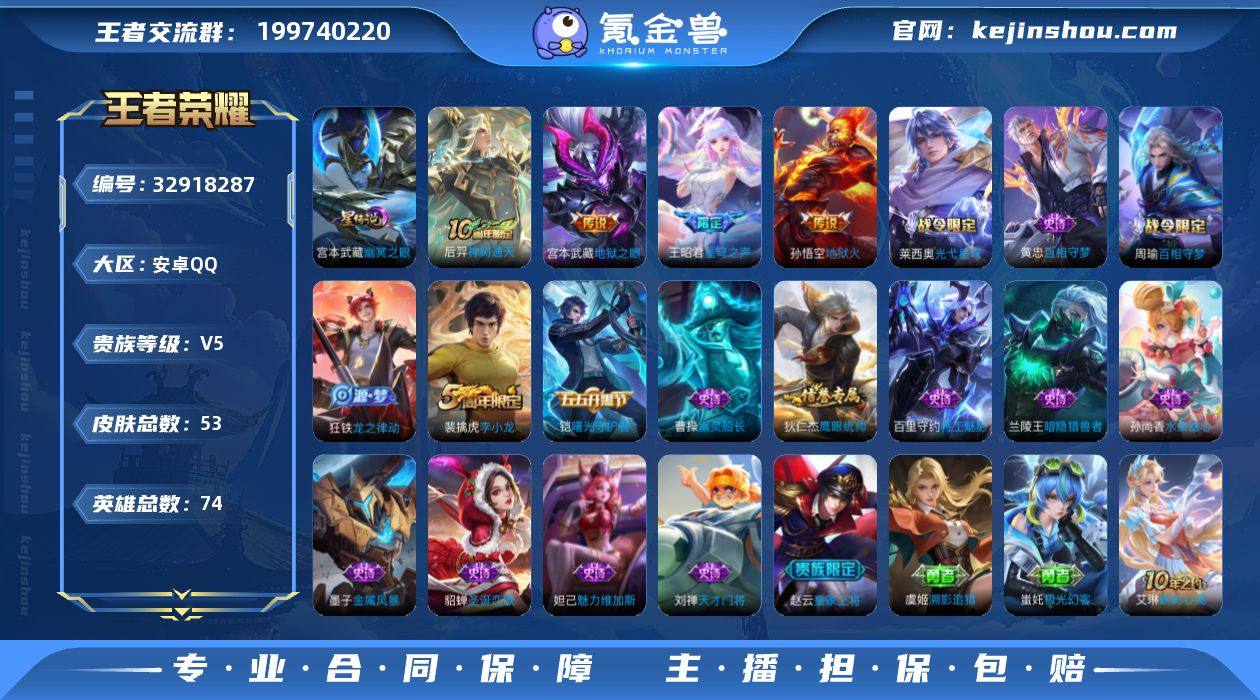 V5 1无双 4传说 1星元 53皮肤 74英雄 【1无双】【4传说】宫本武藏-地狱之眼,孙悟空-地狱火,王昭君-星穹之声,后羿-神树通天【1星元】宫本武藏-幽冥之眼【16史诗】百里守约-特工魅影,曹操-幽灵船长,妲己-魅力维加斯,狄仁杰-鹰眼统帅,貂蝉-圣诞恋歌,铠-曙光守护者,兰陵王-暗隐猎兽者,刘禅-天才门将,墨子-金属风暴,裴擒虎-李小龙,孙尚香-水果甜心,赵云-皇家上将,狂铁-龙之律动,周瑜-百相守梦,黄忠-百相守梦,莱西奥-光弋星穹