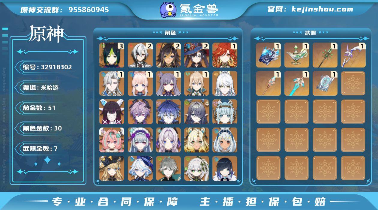 51黄! 冒险等级: 60 3命金色角色: 三命提纳里 2命金色角色: 二命莫娜,二命迪希雅,二命阿蕾奇诺 1命金色角色: 一命刻晴,一命琴,一命珊瑚宫心海,一命那维莱特,一命玛薇卡 0命金色角色: 迪卢克,枫原万叶,七七,钟离,雷电将军,夜兰,纳西妲,艾尔海森,芙宁娜,娜维娅,玛拉妮,希诺宁,茜特菈莉,梦见月瑞希,瓦雷莎,伊涅芙,菈乌玛,菲林斯,杜林,哥伦比娅,兹白 拥有武器: 四风原典,和璞鸢,阿莫斯之弓,天空之刃,天空之脊,千夜浮梦,万世流涌大典 1精武器: 四风原典,和璞鸢,阿莫斯之弓,天空之刃,天空之脊,千夜浮梦,万世流涌大典