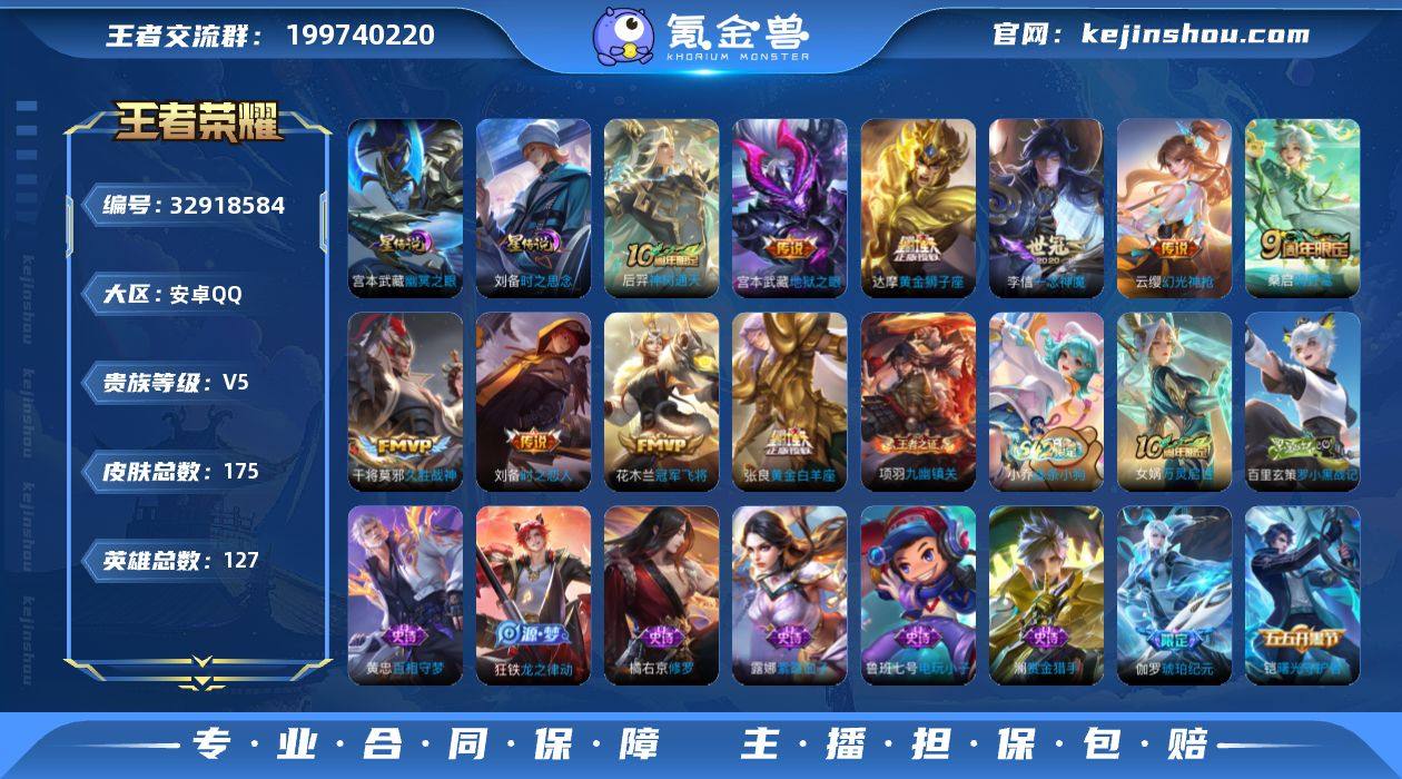 V5 10传说 2星元 175皮肤 127英雄 【10传说】达摩-黄金狮子座,干将莫邪-久胜战神,宫本武藏-地狱之眼,花木兰-冠军飞将,李信-一念神魔,刘备-时之恋人,张良-黄金白羊座,桑启-鸣野蒿,云缨-幻光神枪,后羿-神树通天【2星元】刘备-时之思念,宫本武藏-幽冥之眼【42史诗】鬼谷子-五谷丰年,赵云-未来纪元,澜-赏金猎手,阿轲-节奏热浪,百里守约-特工魅影,曹操-幽灵船长,嫦娥-拒霜思,程咬金-功夫厨神,妲己-女仆咖啡,狄仁杰-鹰眼统帅,宫本武藏-鬼剑武藏,花木兰-水晶猎龙者,橘右京-修罗,铠-曙光守护者,兰陵王-暗隐猎兽者,李白-千年之狐,李元芳-逐浪之夏,刘禅-天才门将,露娜-紫霞仙子,鲁班七号-电玩小子,吕布-末日机甲,墨子-金属风暴,上官婉儿-梁祝,孙策-猫狗日记,孙尚香-水果甜心,孙尚香-蔷薇恋人,王昭君-偶像歌手,夏侯惇-乘风破浪,项羽-苍穹之光,嬴政-摇滚巨星,云中君-纤云弄巧,赵云-皇家上将,刘禅-电玩·爆裂旋风,蒙犽-百解令,蒙恬-荣光圣徽,伽罗-琥珀纪元,狂铁-龙之律动,黄忠-百相守梦,小乔-线条小狗,项羽-九幽镇关,女娲-万灵启世,百里玄策-罗小黑战记