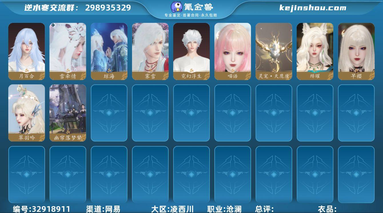 【已用天赏14】战力值:687279 总评:687279 角色等级:89 衣品值: 186755 国色值: 45280 已用天赏石:14 【网易邮箱账号】 【无换绑冷却】 【沧澜】 【女】 【5级】 【把酒临风】 【互通】 副本外观1 天赏外观10 天赏祥瑞1 天赏灵宠1 武器环身1 副本外观:星落月皓; 天赏外观:雪牵情,月百合,霓幻浮生,绯曜,喵语,翠羽吟,早樱,霁雪,琼海,海市蜃楼武器; 天赏祥瑞:幽帘落梦辇; 天赏灵宠:灵宠·天鹰座; 武器环身:临渊一梦;