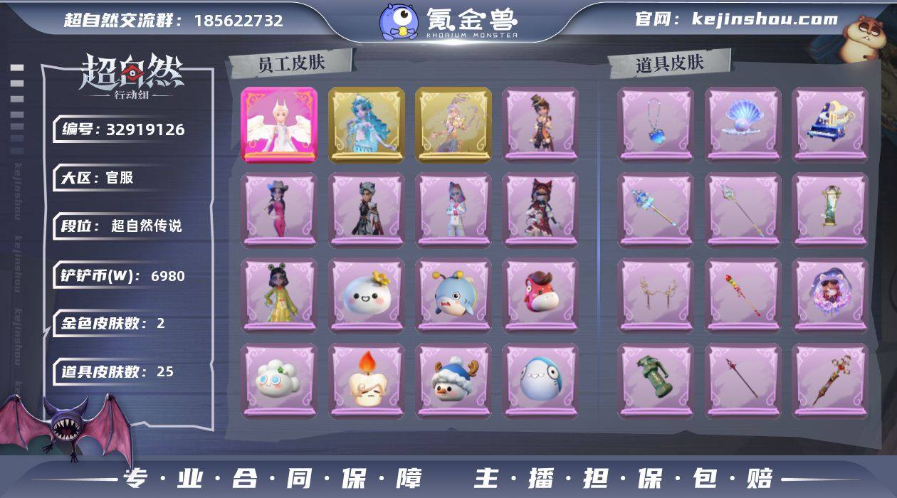 金色皮肤数量: 2 紫色皮肤数量: 6 道具皮肤数量: 25 段位: 超自然传说 员工: 兰 外观: 嘻嘻头套,烈焰红唇头套,呆滞头套,卑微头套,哈士奇头套,滑稽头套,鱼头怪头套,面具马头套,萨卡班甲鱼头套,小狗蛇点点头套,天使消失的年代,钗头凤,呱呱雨衣,火爆了头套,莲华渡,惊魂南瓜,莓果陷阱,潮汐小海兔,糖果守卫,绒绒对决,樱桃奶油布丁,雪墩墩头套,太空鲨头套,尘封旧事,黎明猎手,白鼬趴趴,耀眼的你,庆宴绮愿,炽天使,炽天使的余烬,晚安小熊,烛光纪念,不朽的今夜,牛啤背包,海月息潮,马上有钱头套,饺饺者头套,夜浮船,孤独对望,侧耳倾听,园丁鲨鲨头套,芝麻糊汤圆 亮点: 粉皮1;金皮2;紫皮6;道具皮25;皮肤:小黄-炽天使,薇薇安-海月息潮,逍遥-莲华渡,阿念-庆宴绮愿,小黄-呱呱雨衣,艾伦-黎明猎手,艾伦-绒绒对决,莉莉-莓果陷阱,爱丽丝-耀眼的你;道具:摸金符-海洋之心,喷气背包-乘风溯雪,葫芦-海心凝珠,铲子-龙鳞,夜视仪-金丝眼镜,腰包-惊魂娃娃,折扇-露露扇,短管猎枪-赞萌露比水枪,腰包-宝剑八,急救包-末章心跳,腰包-红运福虎,闪光弹-金戈玄铜,急救包-蔷薇物语,长枪-糖葫芦霸王枪,电击枪-权杖的许诺,夜视仪-敛花容,音响-鸣沙鼓,长枪-波塞冬,长鞭-缚誓之锁,音响-月光奏鸣曲,传送按钮-浮生一...
