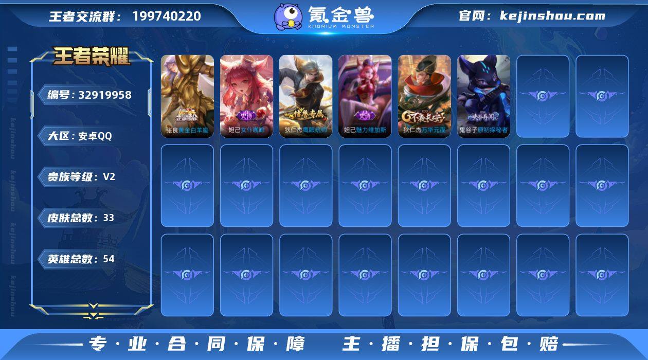 实名: 不可修改 贵族等级: V2 英雄数: 54 皮肤数: 33 传说皮: 黄金白羊座