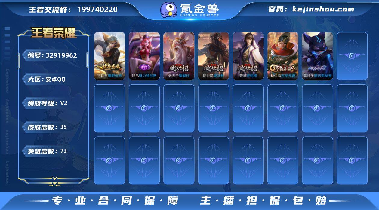 实名: 可修改 贵族等级: V2 英雄数: 73 皮肤数: 35
