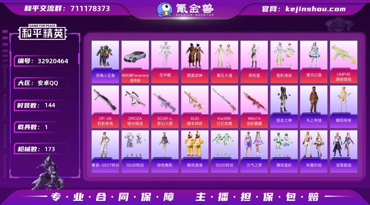 【1载具 7特效枪 6粉装 173枪皮 144套装】地铁号 5万热力值 保时捷Panamera(星辰紫) 沙漠毒蛇,深海小丑鱼,小丑鱼,NV战队服,军刀雅典娜,霓裳武神,第五大道,茉莉星,莲影清波,雪月幻音,花中眠 GROZA-镜光银凌,SCAR-L-梦幻火箭,AUG-暖羊咩咩,Kar98K-巳巳如意,Mini14-龙虾霸霸,UMP45-萌骑冒险,DP-28-豹影疾电 挂凌工作白 df65-21,编号:WPPSH11