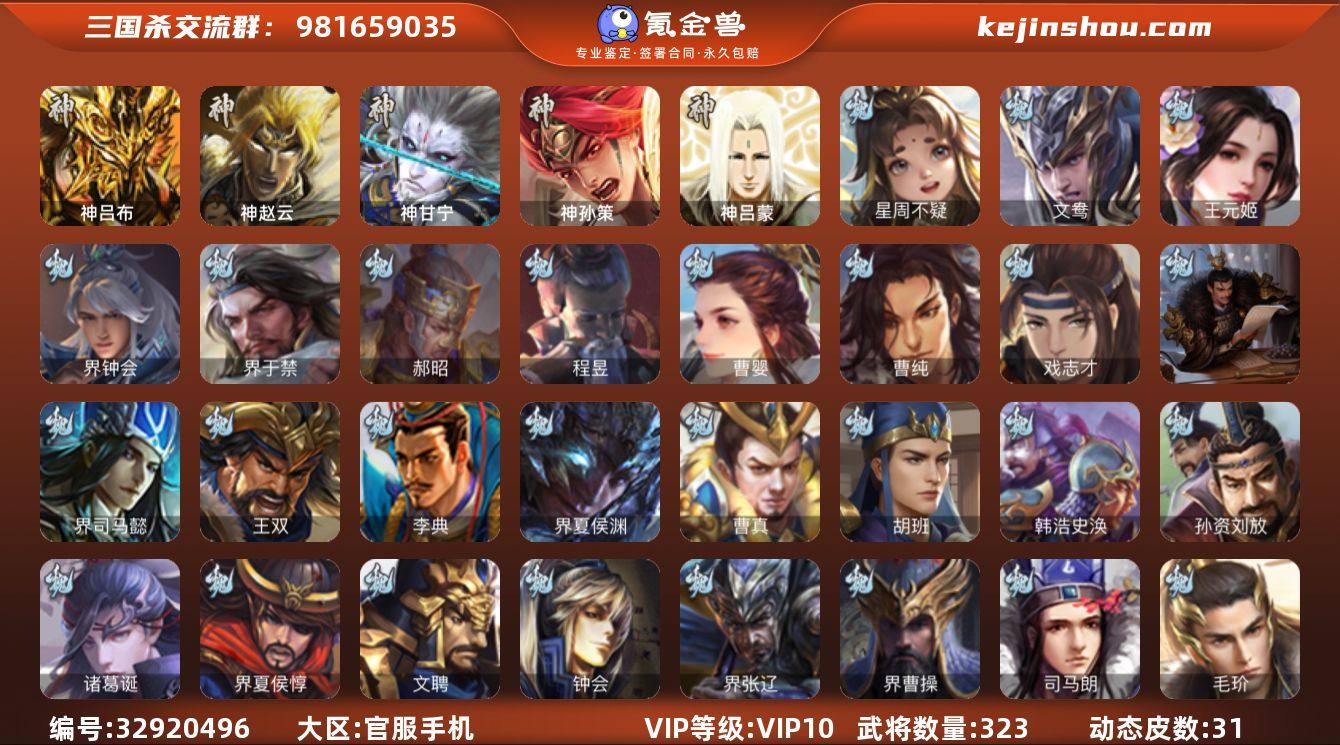 【4601】官阶:大将军;VIP等级:VIP10;史诗武将数量:37;动态皮肤数量:31;武将总数:323;史诗宝珠数量:31;将魂数量:3010;神将:4;魏国史诗武将:16;蜀国史诗武将:9;吴国史诗武将:5;群史诗武将:12